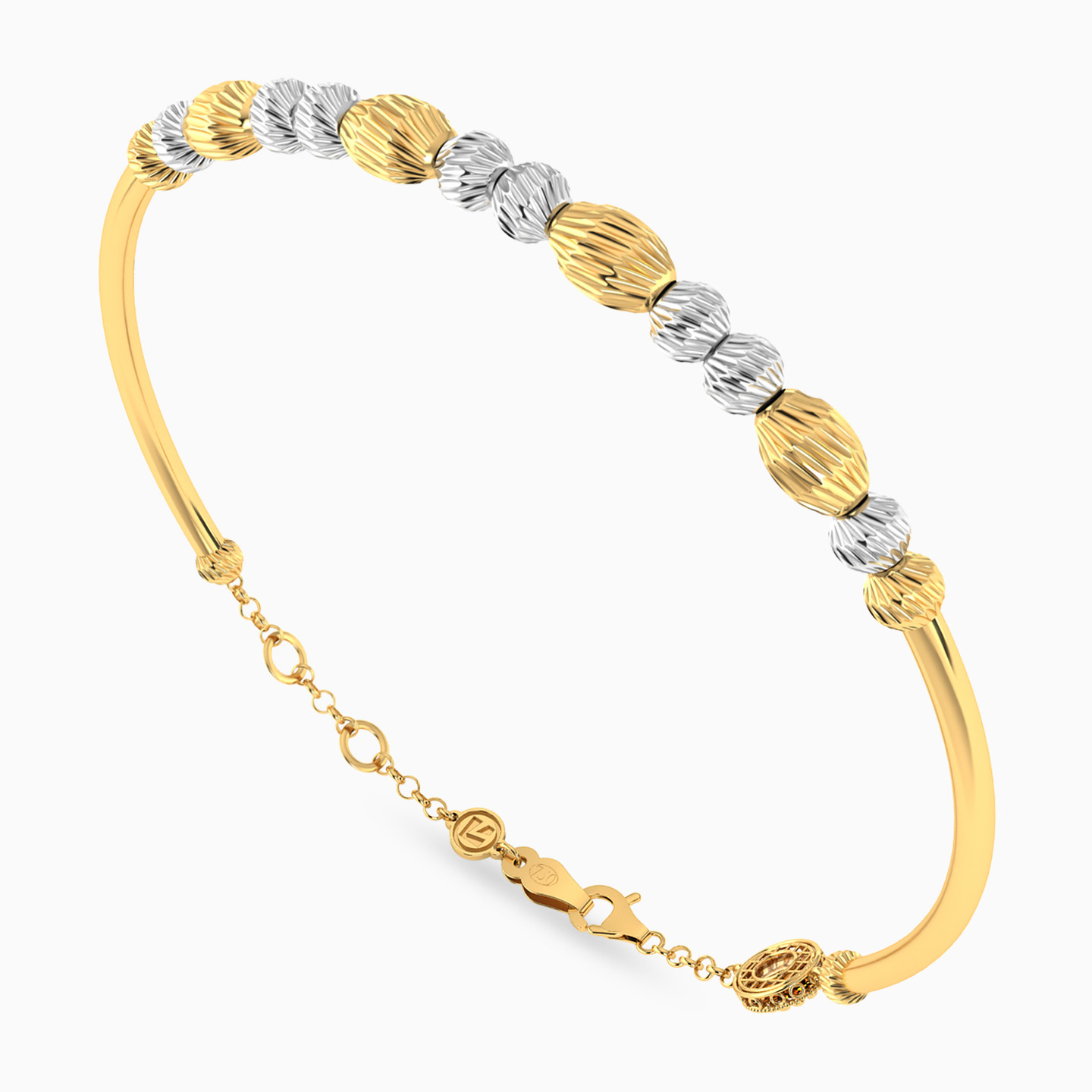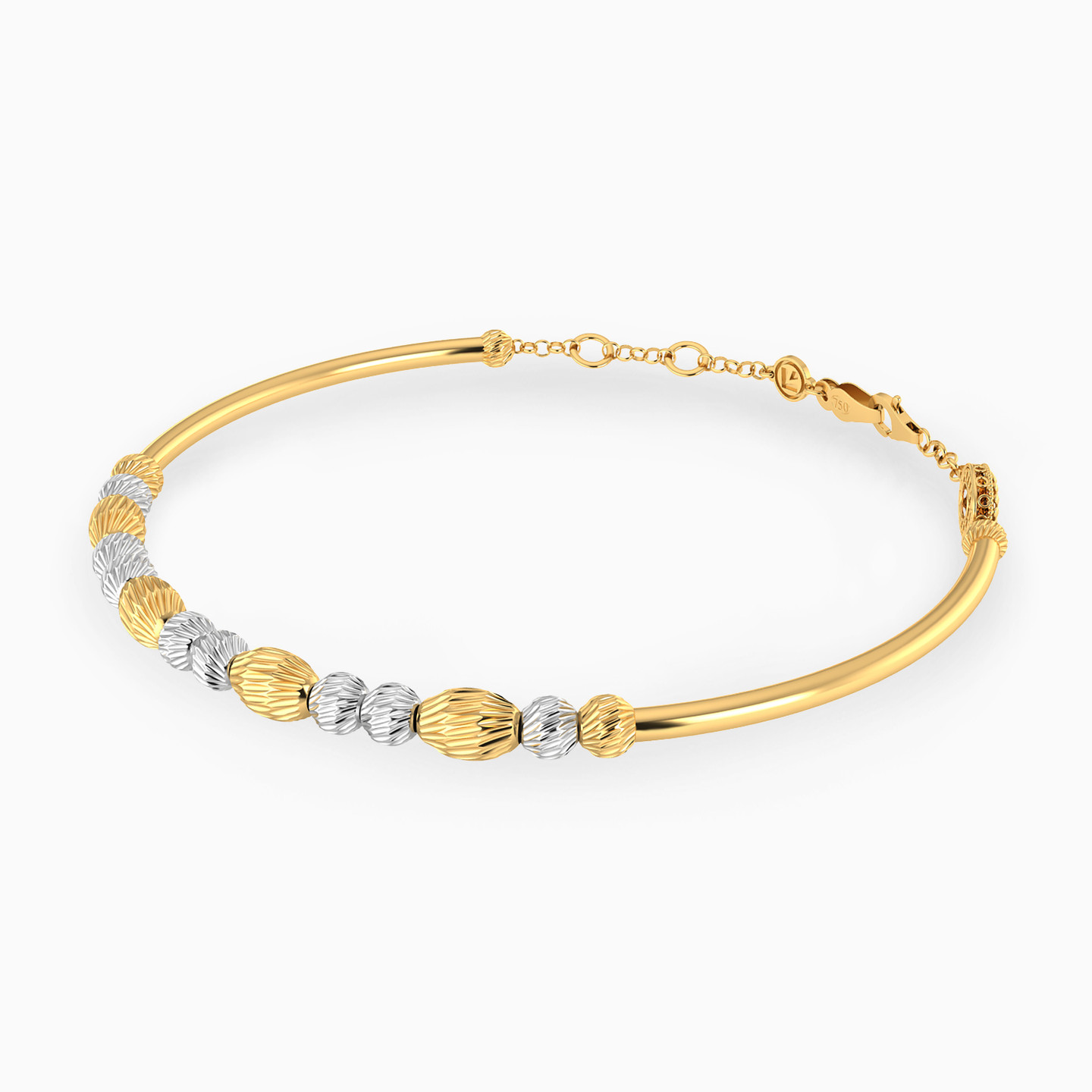 This 18-karat yellow gold bangle bracelet from L'azurde Gold is a radiant fusion of texture and style! This bracelet is adorned with a delightful array of beautifully textured 18-karat white and yellow gold round and hexagon-shaped beads, meticulously arranged to create a captivating pattern at the center. Wrap your wrist in the exuberance of this bangle, where the warm glow of gold meets the chic allure of textured shapes, making it a great pick for instantly glamming up any outfit.