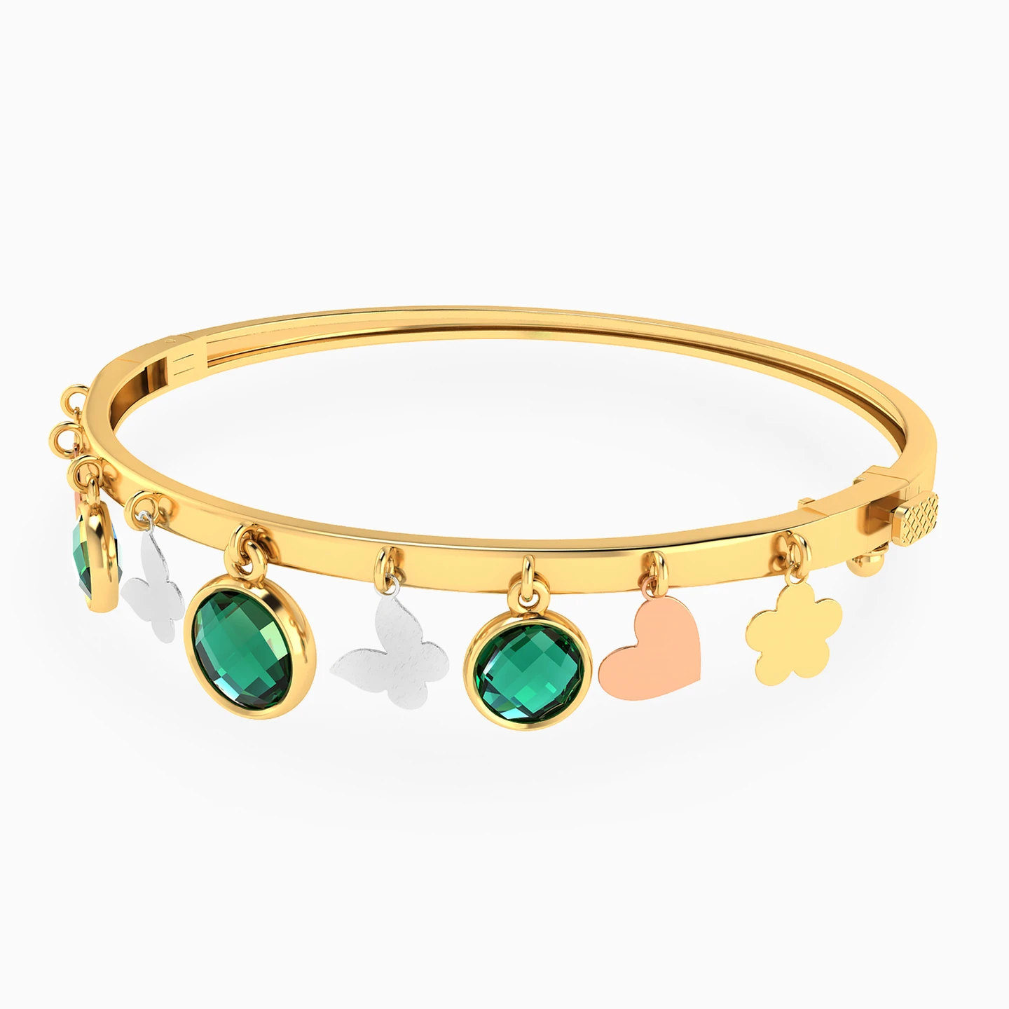 Invest in timeless elegance with this exquisite piece from Lazurde Gold! This charming yellow gold bangle bracelet is adorned with small charms of heart, butterfly and flower shapes, beautifully accented by circular charms featuring vibrant green stones. The playful yet elegant design creates a dynamic rhythm, making it a perfect statement piece that adds color and personality to your wrist with timeless sophistication.