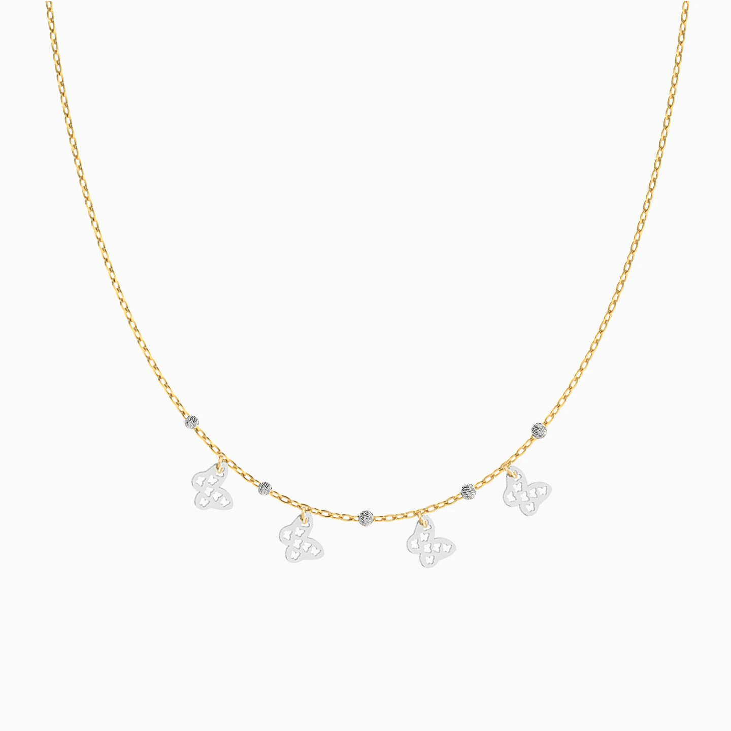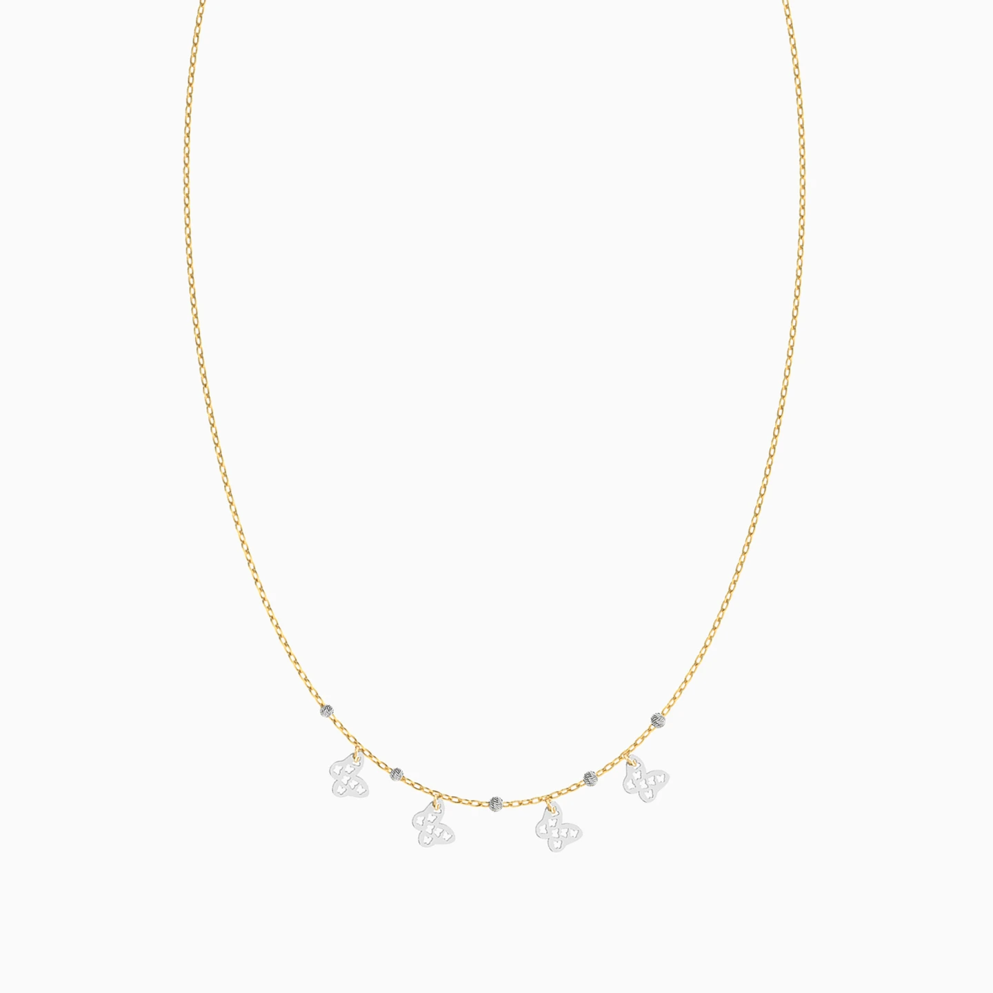 Petite butterflies line up on this Miss L’ necklace to lend a playful touch to your outfit. We love the white gold cut work butterfly motifs and the delicate yellow gold chain. This piece will effortlessly work itself into your work to weekend wardrobe.