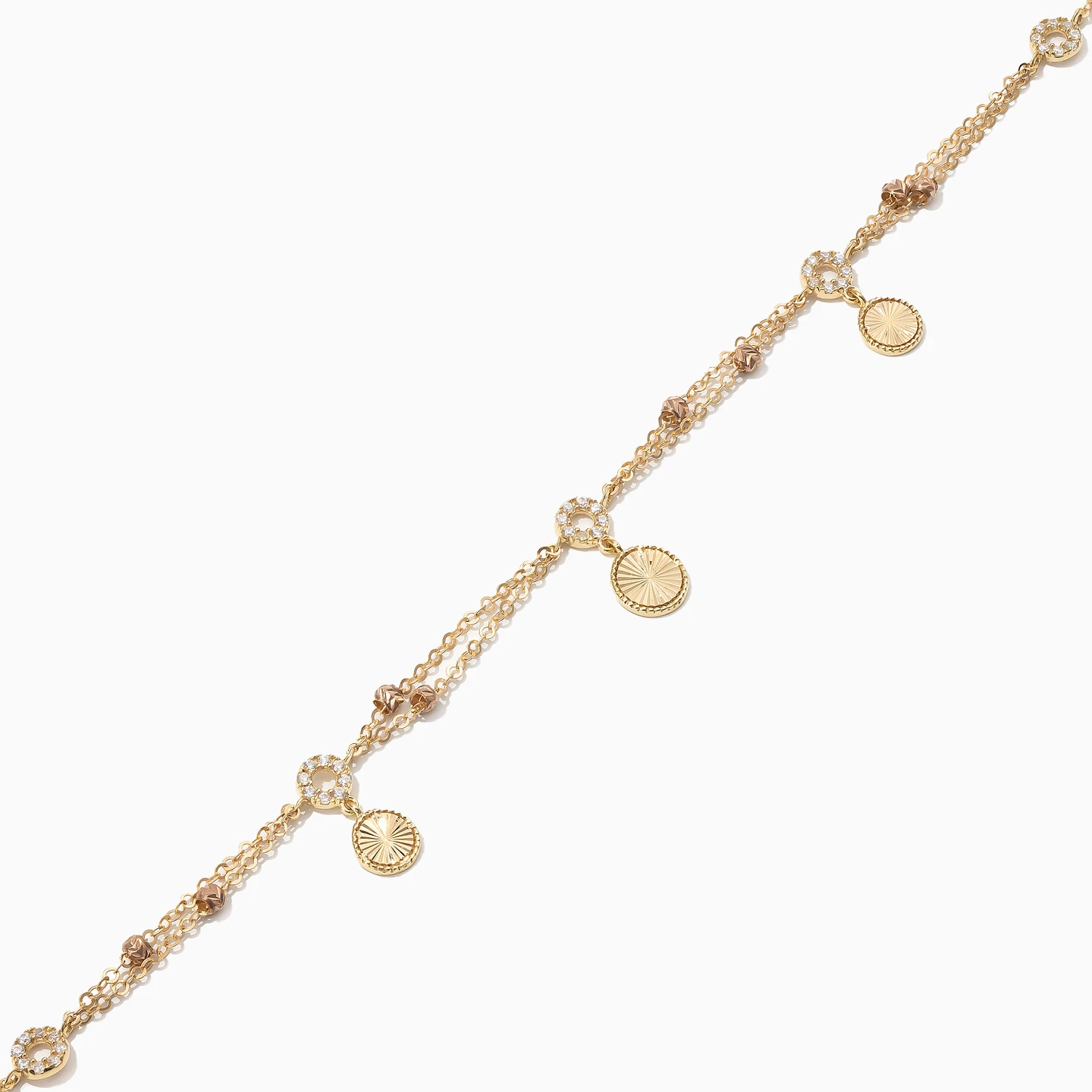 Wrap your wrist in a beautiful symphony of sparkle and shine with this 18-karat yellow gold chain anklet from L'azurde Gold. Dainty dual chains, adorned with petite gold beads, delicately embrace three circular frames, each resplendent with prong-set round cubic zirconia stones meticulously spaced for a harmonious aesthetic. The showstopper comes in the form of dazzling circular dangles, each adorned with ribbed textures, creating an exquisite dance with every movement.