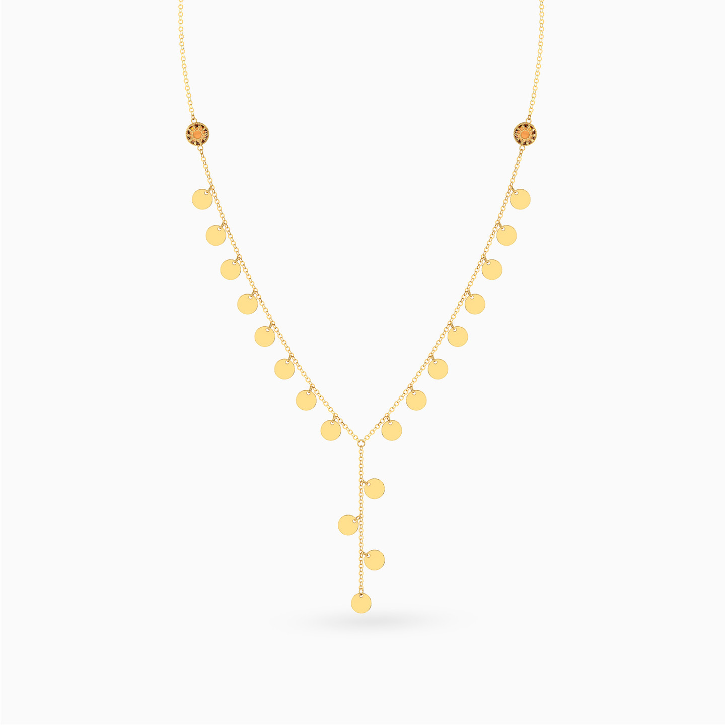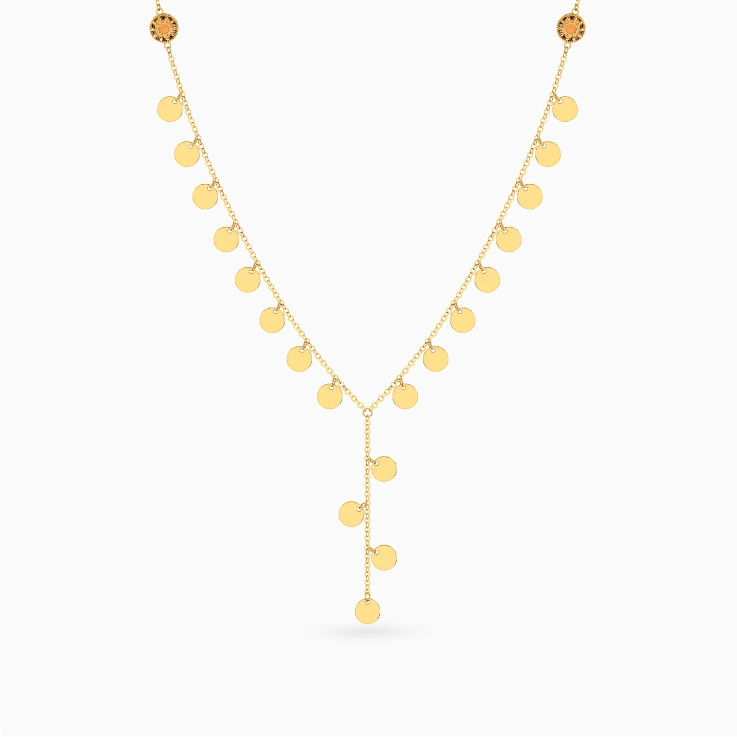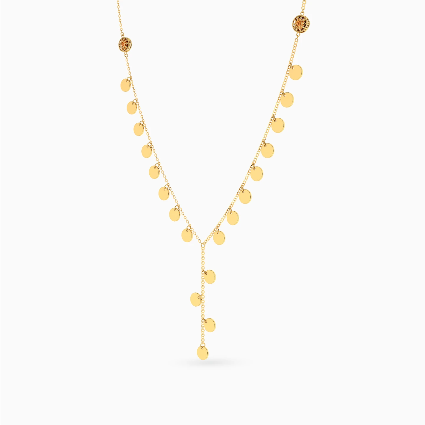 Like golden drops in motion. This Lazurde Gold Y-shaped necklace shimmers with a line of polished circular charms cascading along its delicate chain, creating a graceful rhythm with every movement. A versatile treasure that blends modern charm with timeless elegance, making it an unforgettable gift.