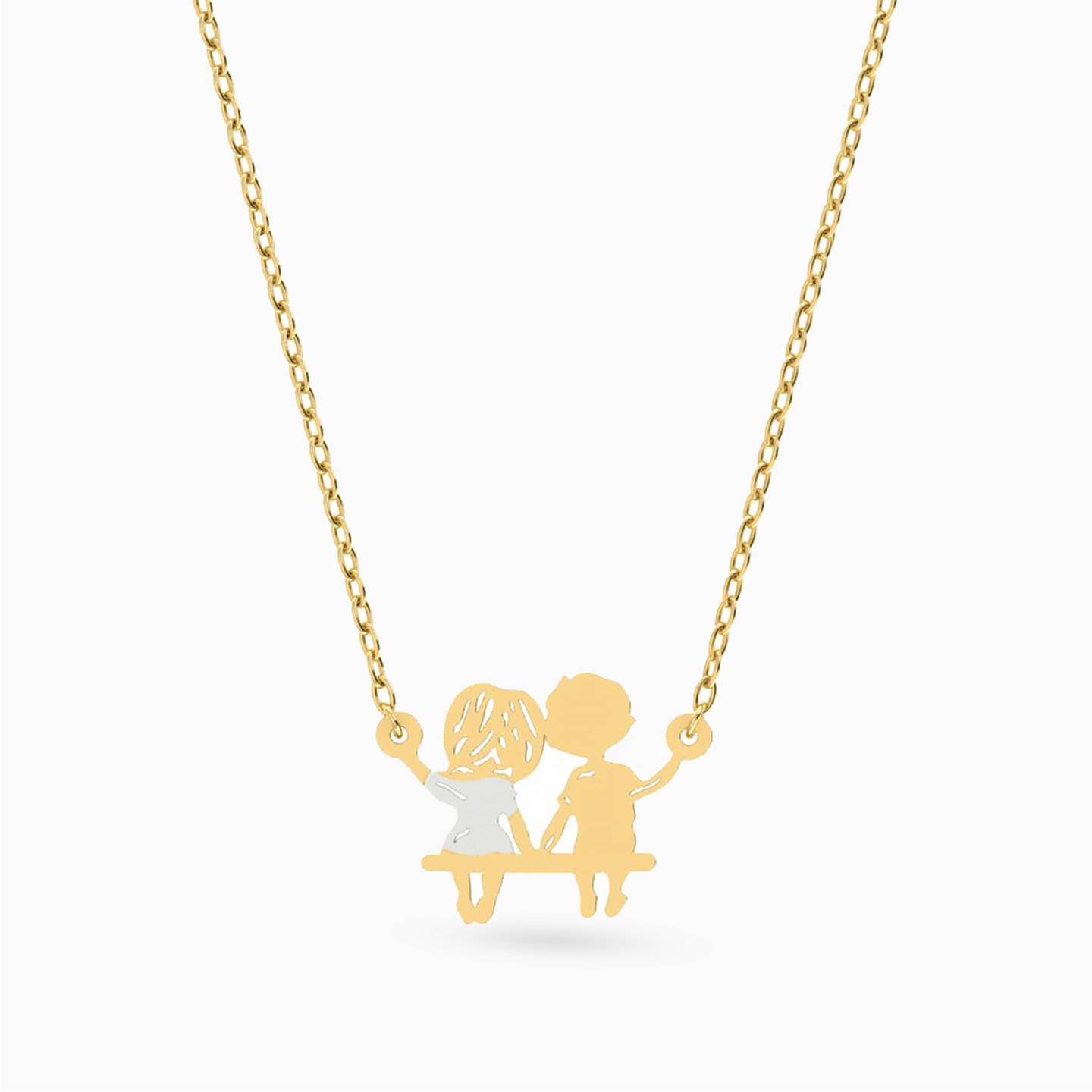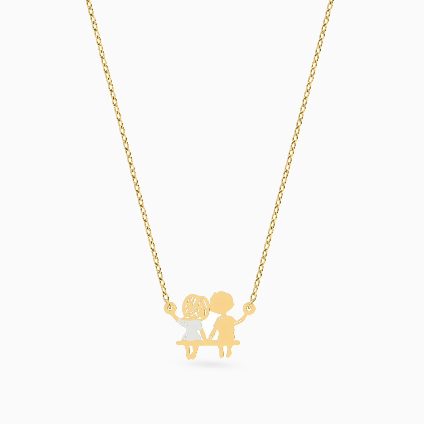 This playful necklace captures the innocence of young love with two children sitting hand in hand on a swing. A charming piece full of nostalgia and warmth, perfect as a heartfelt gift or a keepsake of sweet memories.