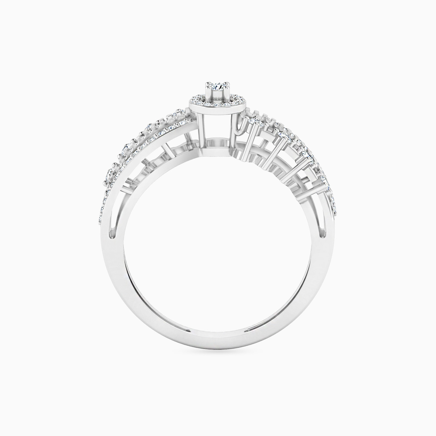 Three sleek bands of 18-karat white gold come together with a studded halo in the center of this gorgeous statement ring by L'azurde Diamonds. With brilliant cut pave diamonds on one side and prong set diamonds on the other and completed by a textured sleek band in the center, this ring is just the dazzling touch you need for your party outfit. Please note: This ring is sold without the center diamond stone.