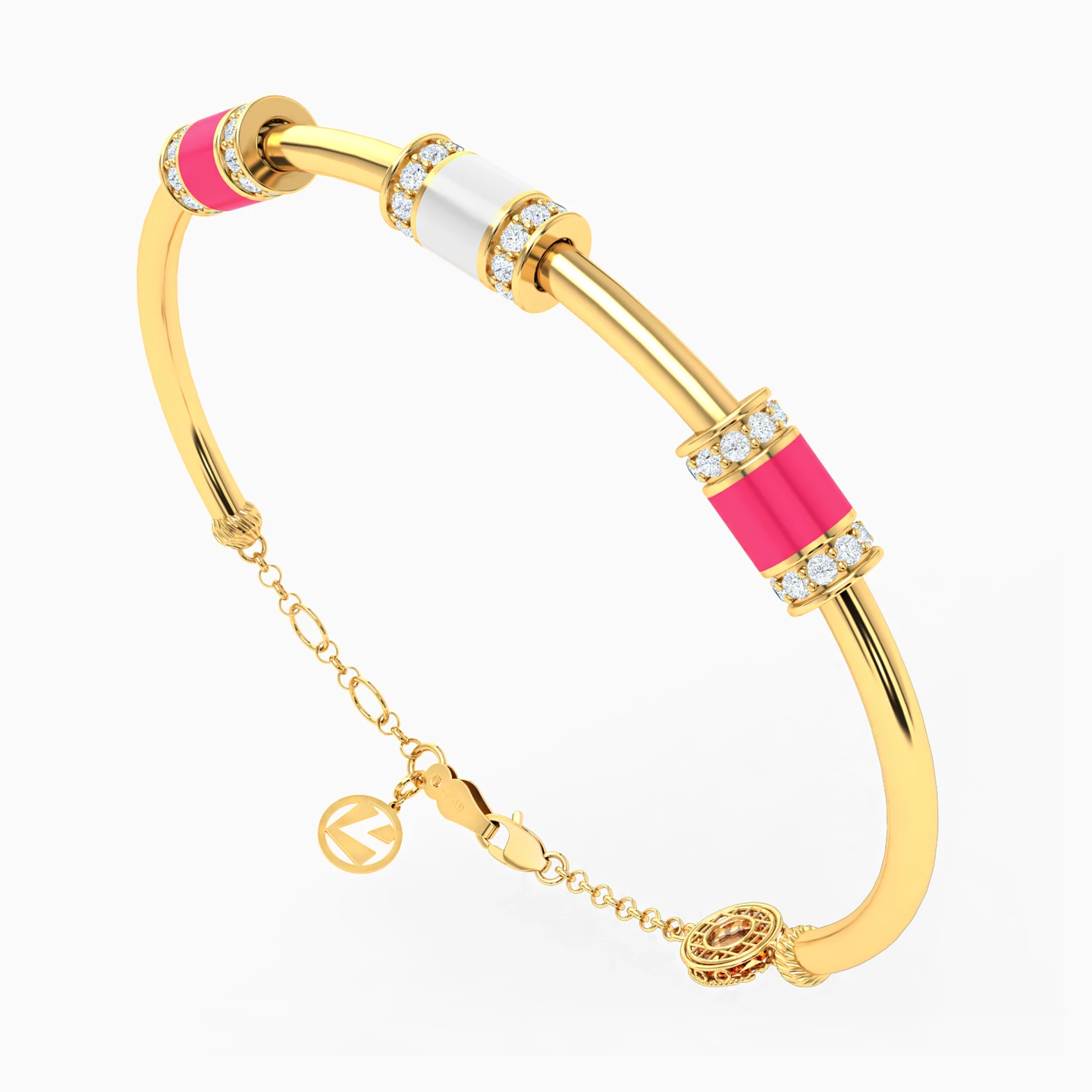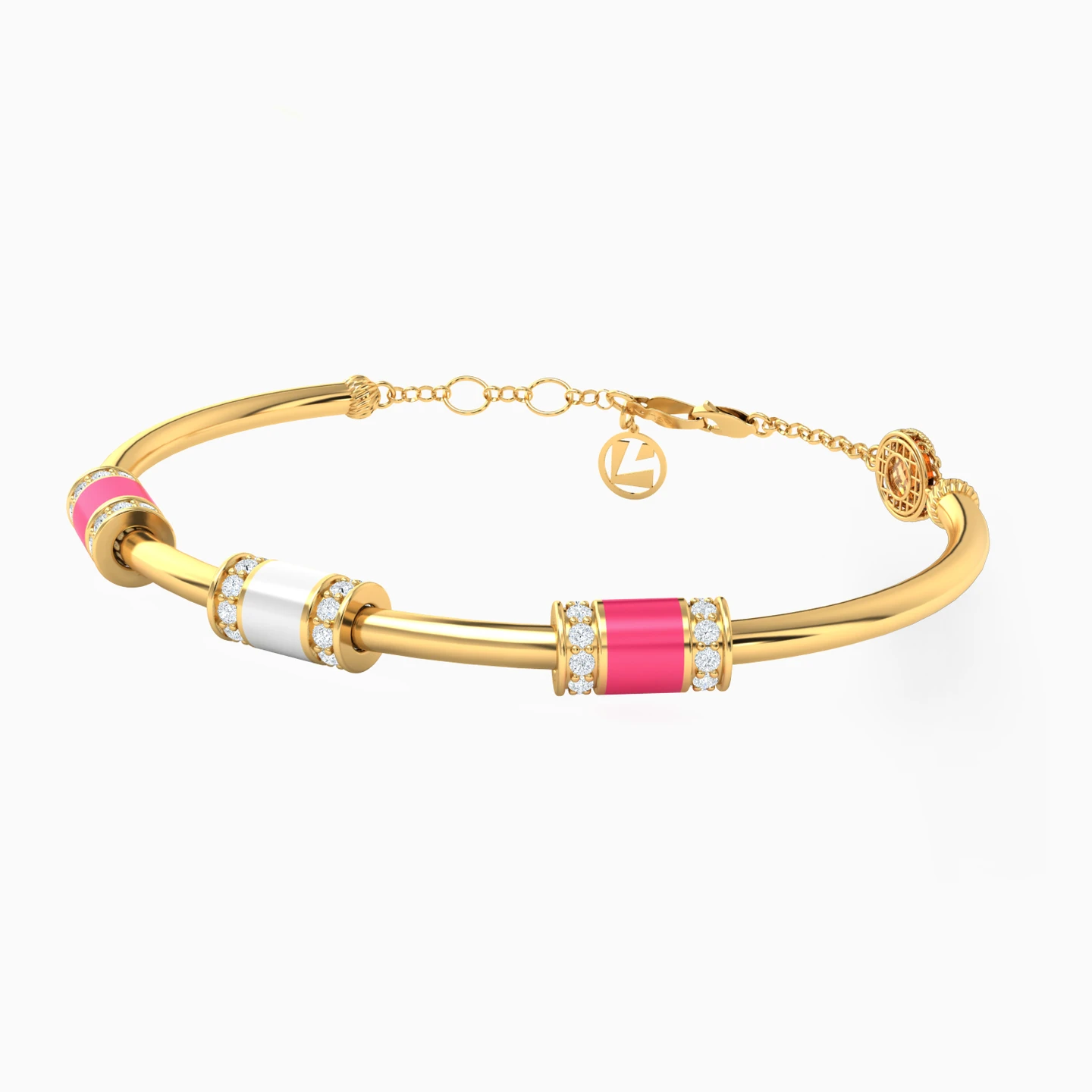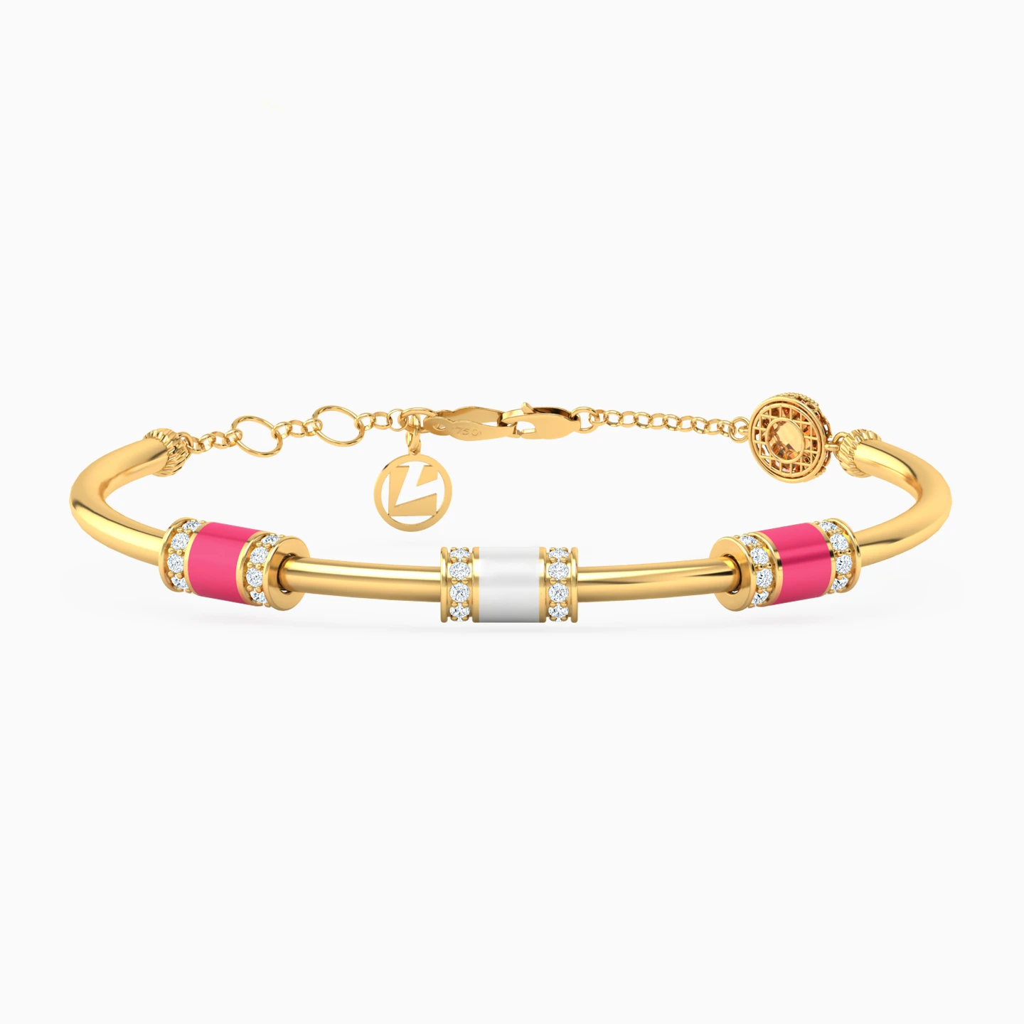 Step into the world of playful elegance with this 18-karat yellow gold bangle from L'azurde Gold that's truly a celebration of color and style! In the center, three perfectly spaced cylinders take center stage, each adorned with enchanting enamel coatings and a circle of round-shaped cubic zirconia on either side. The central cylinder shines in white enamel, while the two flanking cylinders add a pop of pink to the mix. Secured with a dainty chain and lobster clasp, this bangle is the perfect accessory for those who adore vibrant and whimsical fashion.