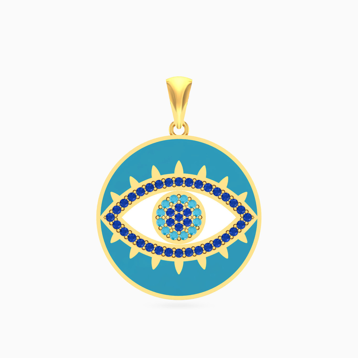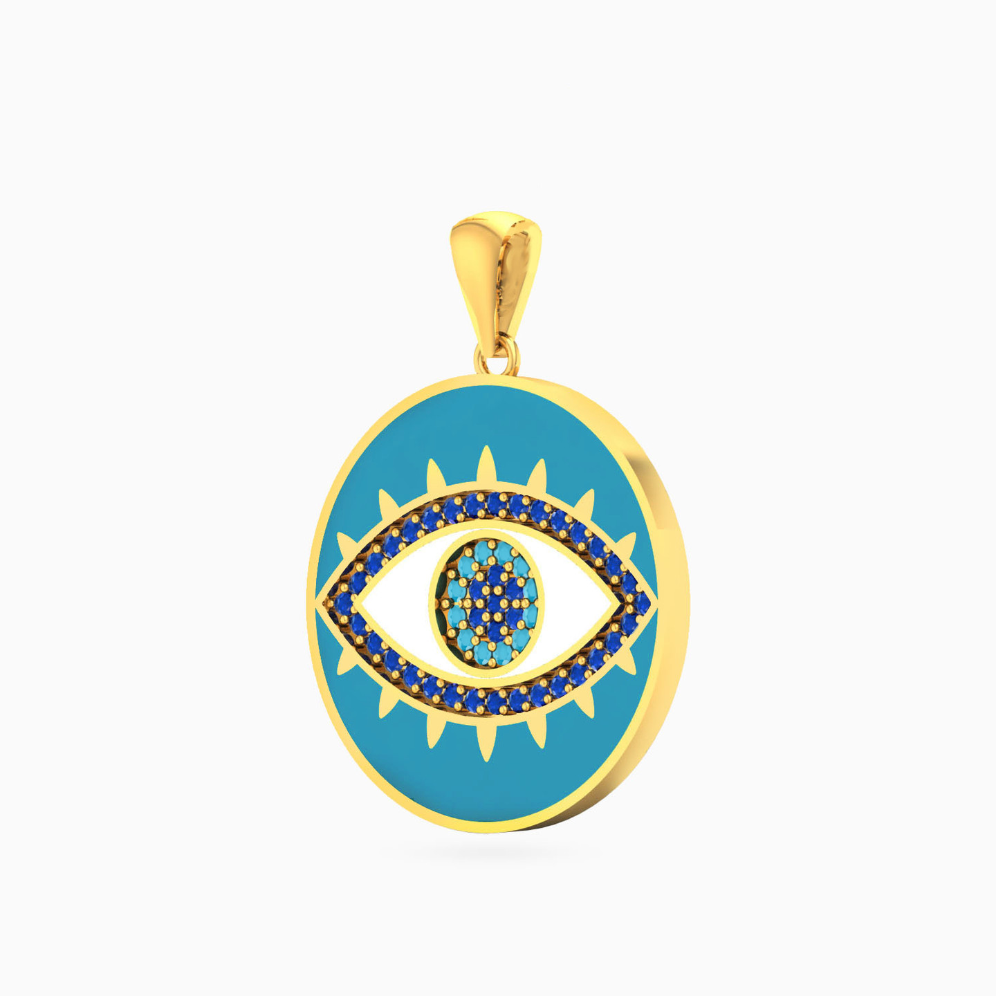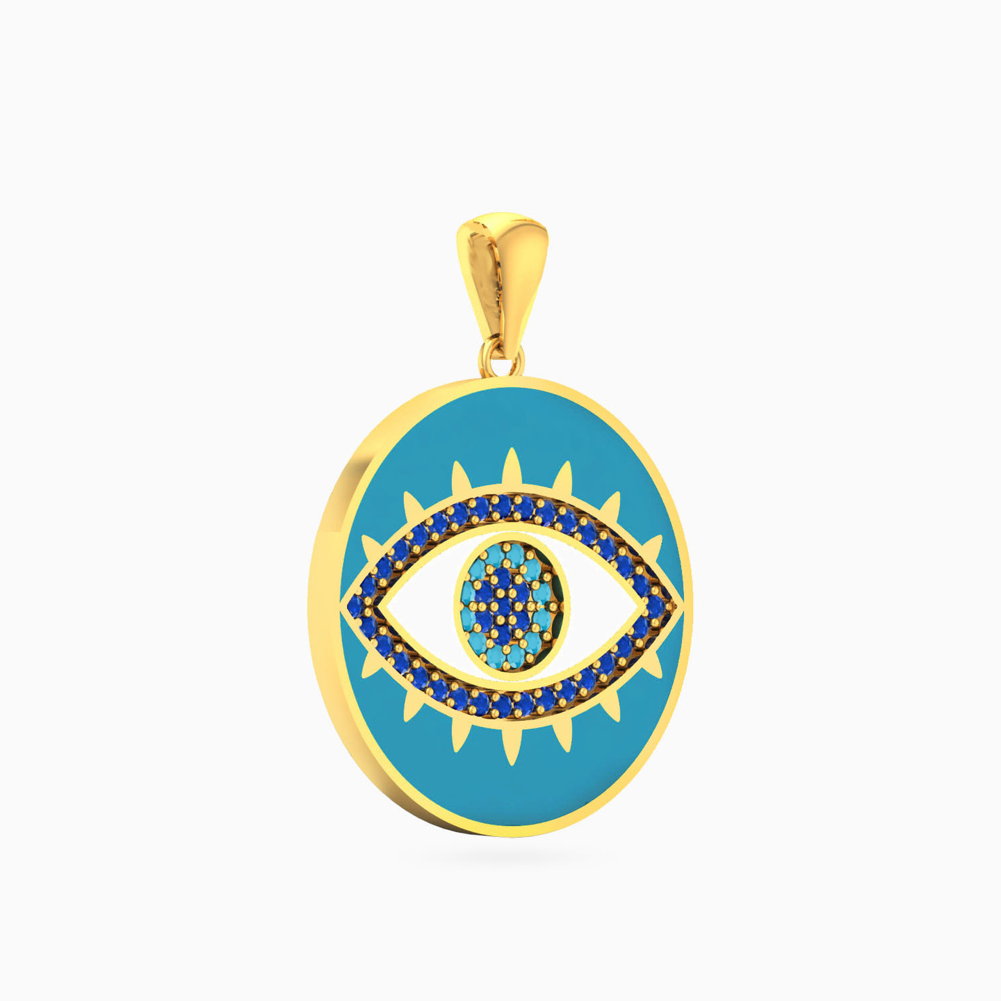 Ward off dull fashion with this 18-karat yellow gold pendant from L'azurde Gold that features a stunning evil eye that's a beacon of both protection and style. Nestled at the core of a circular pendant, the evil eye is adorned with sparkling round-shaped colored stones, creating a mesmerizing gaze that captivates attention while the vibrant blue enamel coating surrounding the pendant adds a pop of color. This pendant is a symbol of protection but also a playful statement piece for any fashionista.