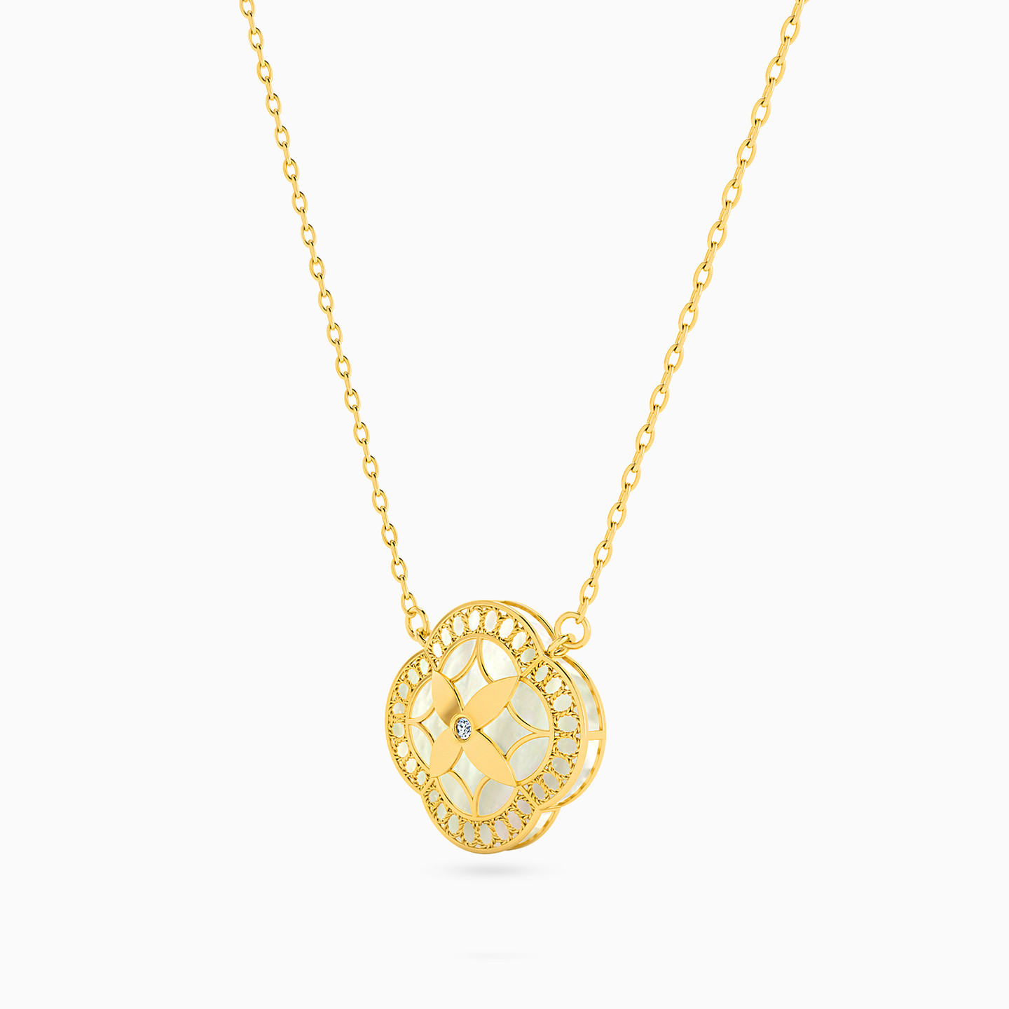 This intricate piece from L'azurde Instyle will make you feel all stylish every time you step out wearing it. It is accented with mother of pearl in an 18-karat yellow gold setting and suspended from a dainty chain. Wear it with your occasional outfits or with your everyday wardrobe as you like.