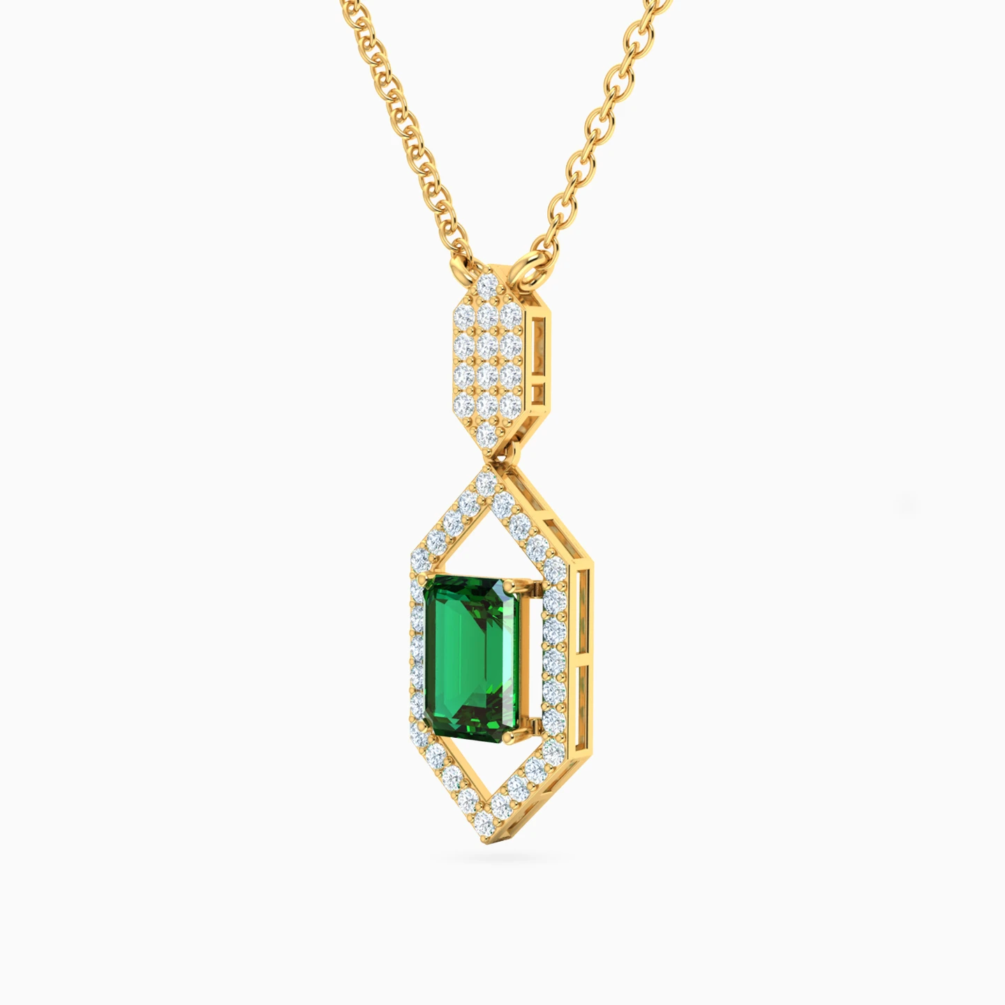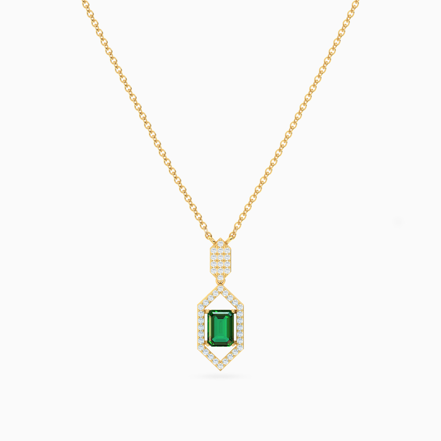 A spark of timeless allure. This Lazurde Gold necklace features a geometric pendant framing a vivid green stone, surrounded by a halo of shimmering cubic zirconia. A refined statement of elegance and individuality, perfect as a treasured keepsake or a meaningful gift.