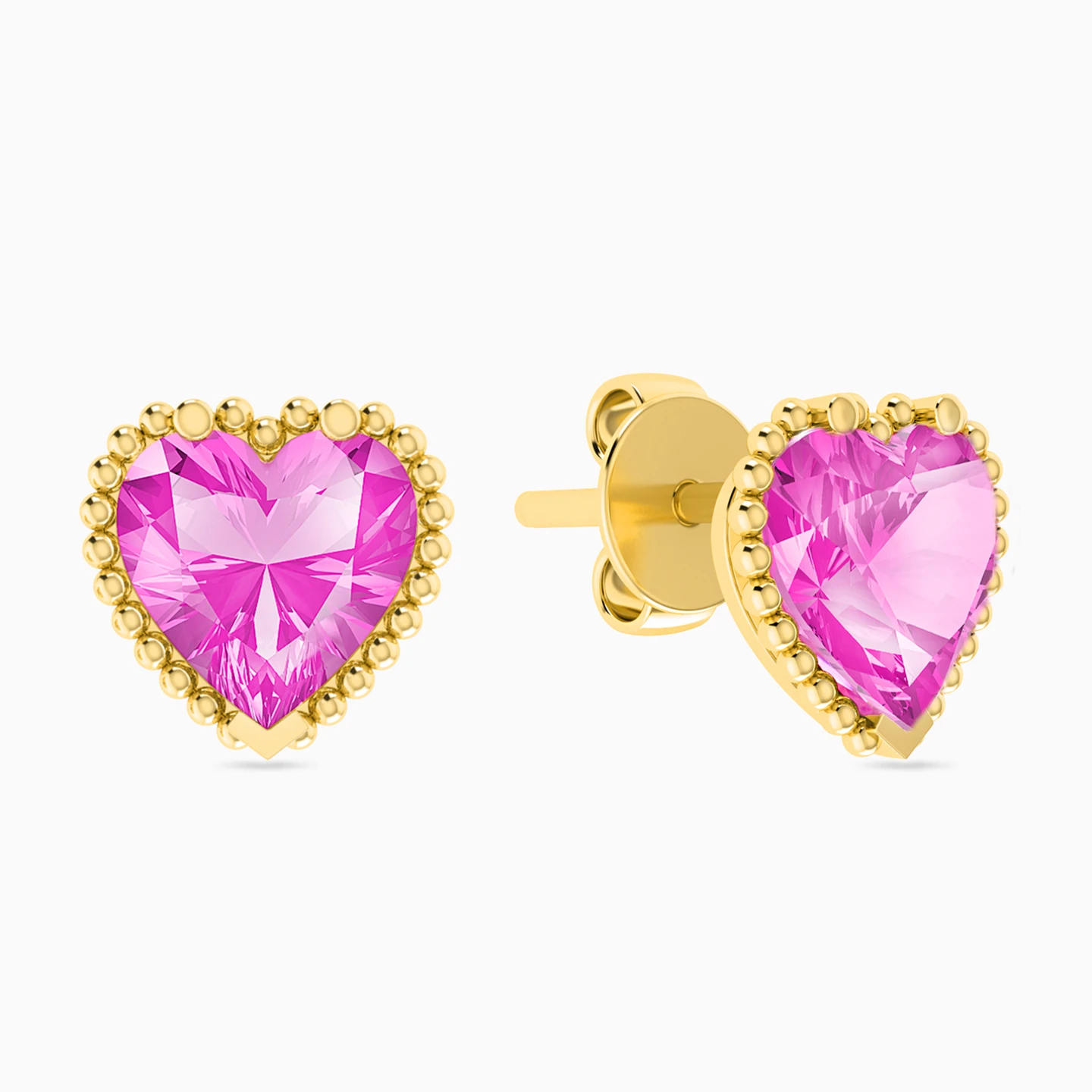 Add a contemporary vibe to your everyday style with these pink stone ear studs from Miss L’. Flaunting themselves as a true statement piece, the heart shaped pink stone is framed within a textured 18-karat yellow gold border. We recommend pairing these with your day to evening outfits with a matching necklace to complete the look.