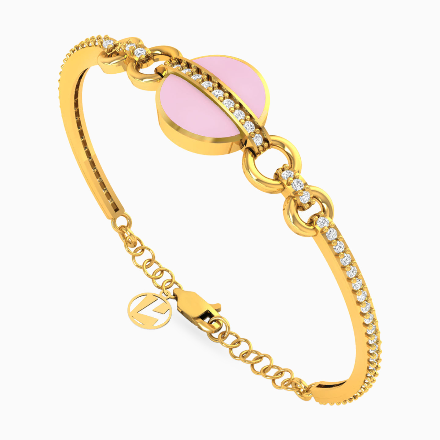 make you kids step out in style looking graceful and feminine with this captivating bangle bracelet from L'azurde Gold adorning your kid's wrist. Beautifully cast in 18-karat yellow gold, this gorgeous piece showcases an eye-catching enamel coated charm at the center with dazzling cubic zirconias sparkling around the bangle. For dressing up or going casual, this elegant bangle bracelet will shimmer with every move, instantly adding a touch of luxury to your wardrobe.