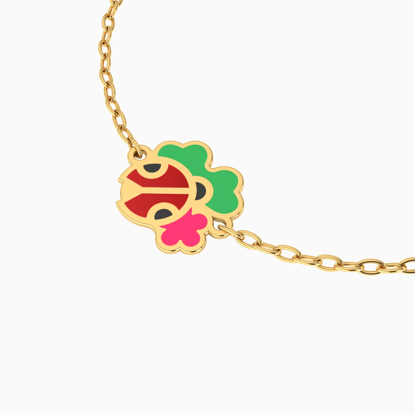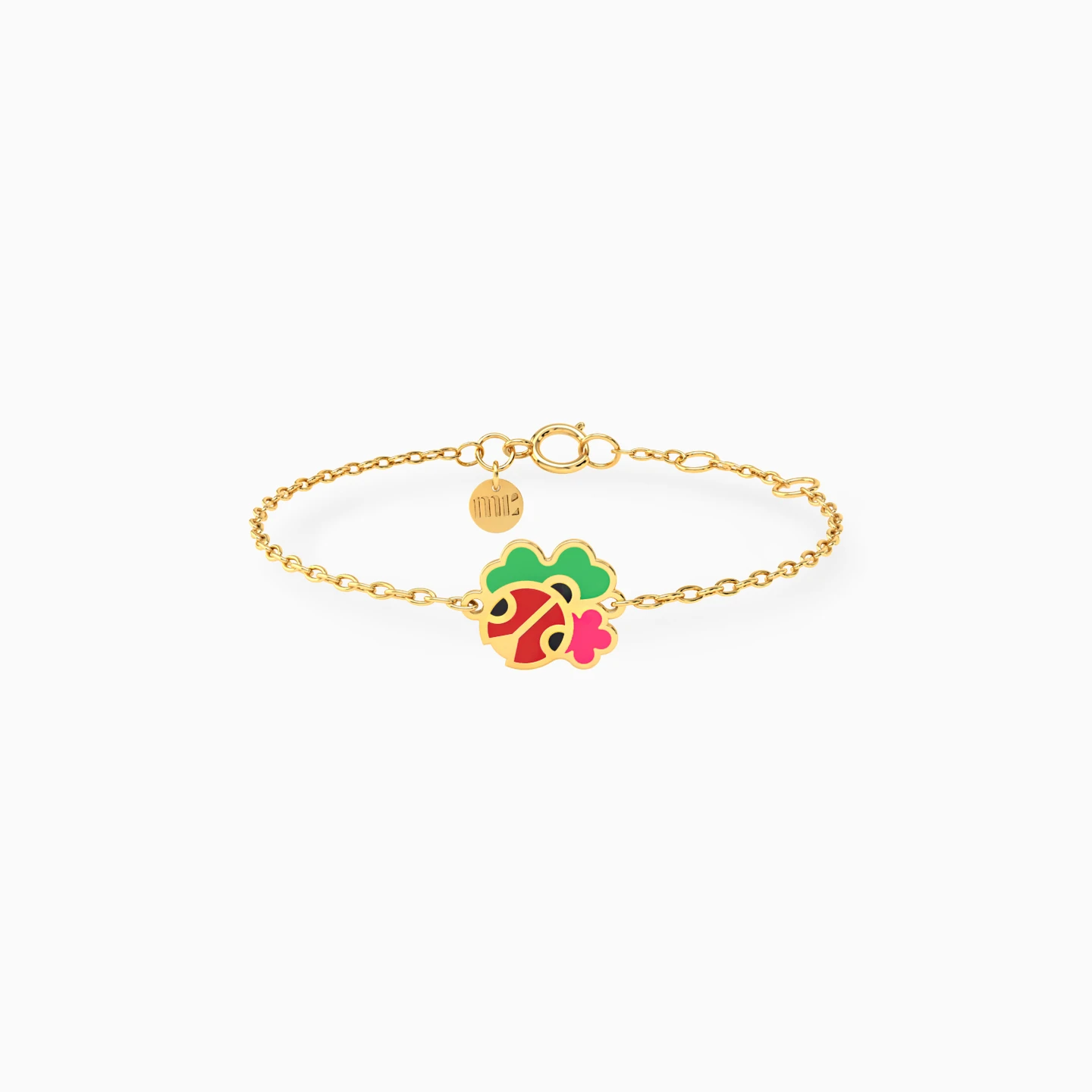 Add a touch of whimsy to your little one's wrist with this 14-karat chain bracelet from Miss L'. It features a dainty chain with a lively cluster in the center featuring two vibrant flowers and an adorable little ladybug, all adorned with a burst of vibrant enamel coating. This bracelet is a garden-inspired statement and is perfect for the mini nature enthusiast!