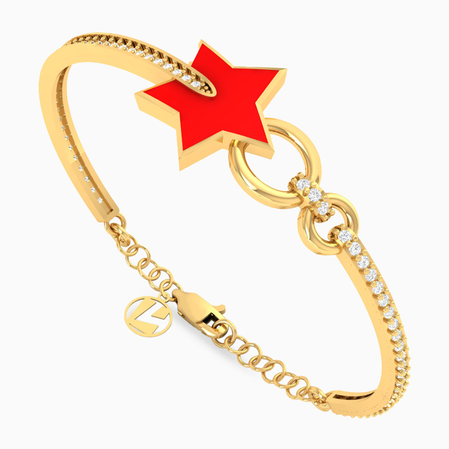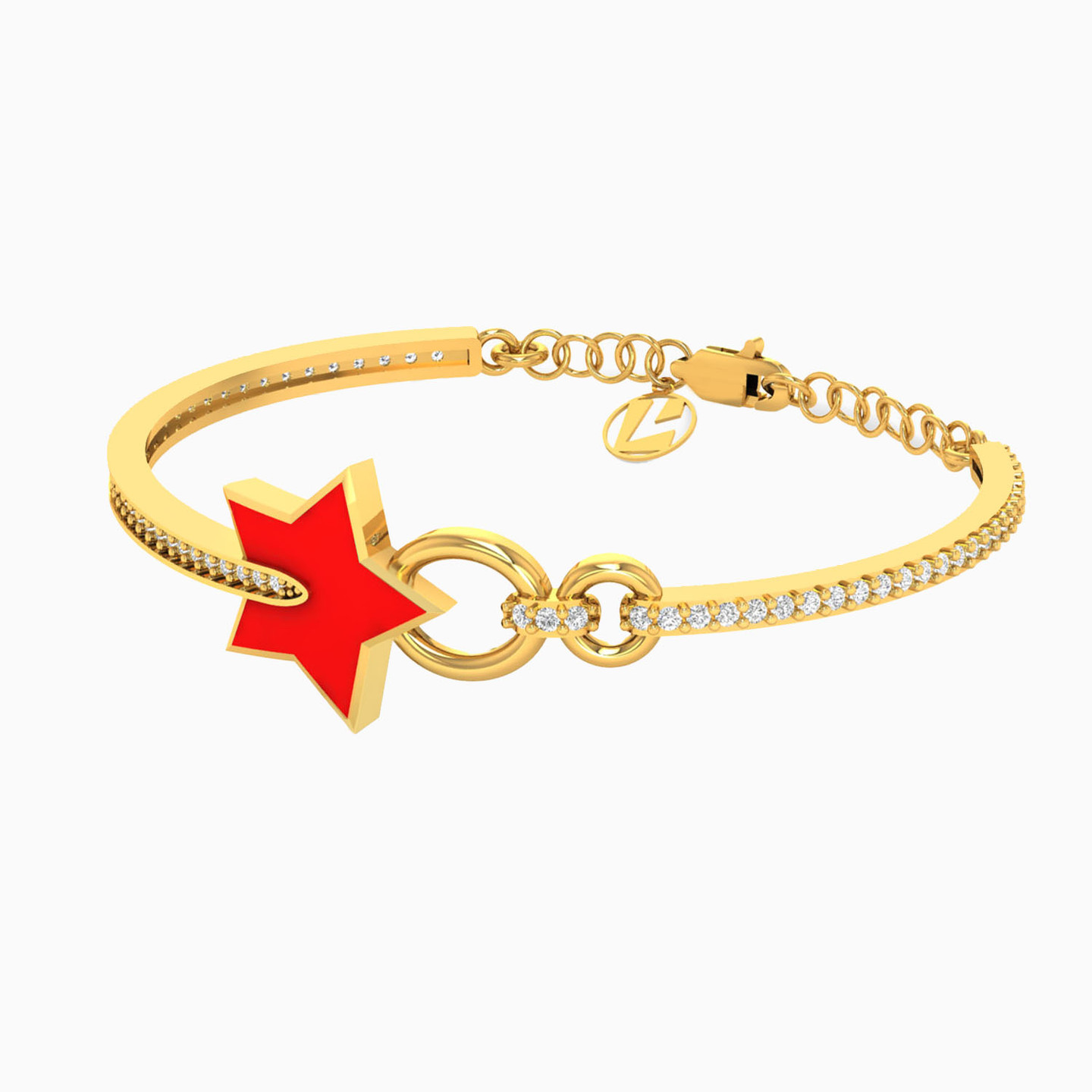 Be the shining star of your own story by stepping out with this gorgeous bangle bracelet from L'azurde Gold for Kids on your wrist. Beautifully crafted in 18-karat yellow gold, this stunning bracelet features a bright enamel coated colored stone star at the center, adorned with a ribbon of cubic zirconia accents that run down both sides. The epitome of sophistication, this piece also features round open chain links with cubic zirconia accents for additional sparkle. We love how this magnificent bracelet instantly elevates a casual outfit or dressy attire.