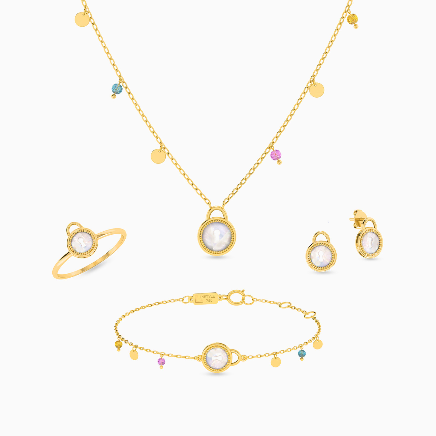 Lock Pearls & Colored Stones Full Set in 18K Gold (4 Pieces)