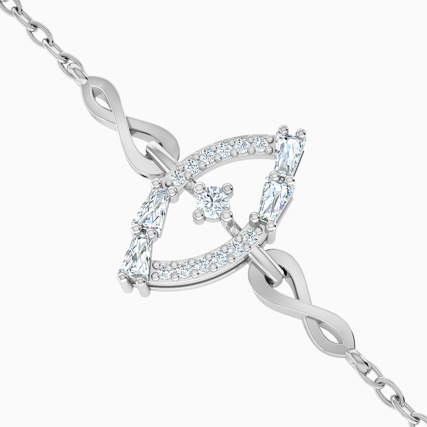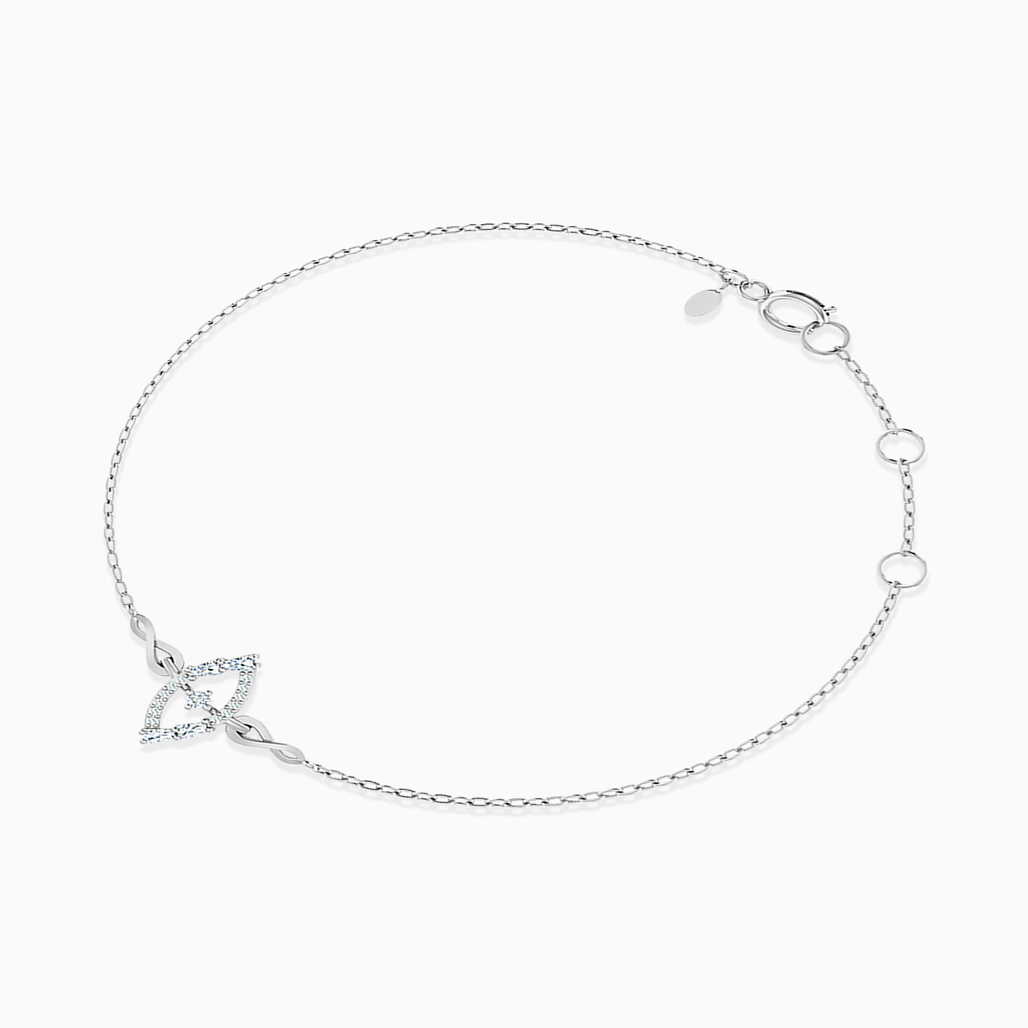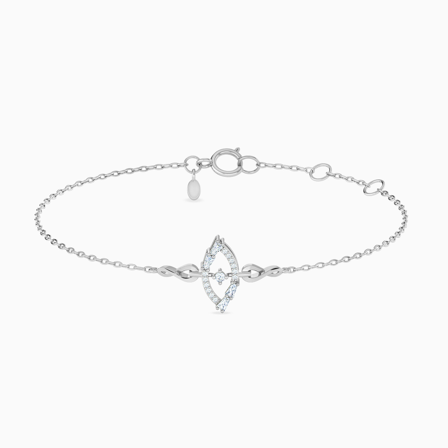 A delicate and dainty bracelet to wrap around your hands. Crafted from 18-karat white gold, this chain bracelet from L'azurde Diamonds features a marquise-shaped frame as a centerpiece that is delicately lined with brilliant cut diamonds, creating a dazzling display of sparkle. At the heart of the frame rests a prong-set marquise-shaped diamond, radiating a captivating brilliance. It is further enhanced by lovely eternity knots on either side, symbolizing eternal love and unity. This bracelet is a perfect blend of elegance and symbolism, making it a cherished accessory for any occasion.