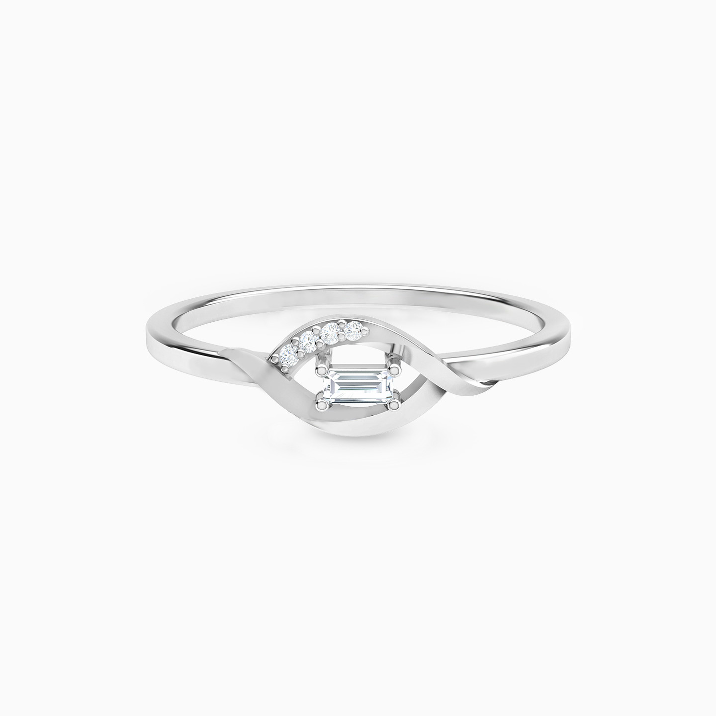 Embrace the beauty of simplicity with our 18-karat white gold statement ring by L'azurde Diamonds. This captivating piece showcases a minimalistic design with swirling bands that gracefully form a marquise shape at the center that glistens beautifully with four sparkling 0.04-carat brilliant cut diamonds. The baguette-cut diamond nestled in the center adds a timeless allure to the understated elegance of the ring. Perfect for those who appreciate refined sophistication.