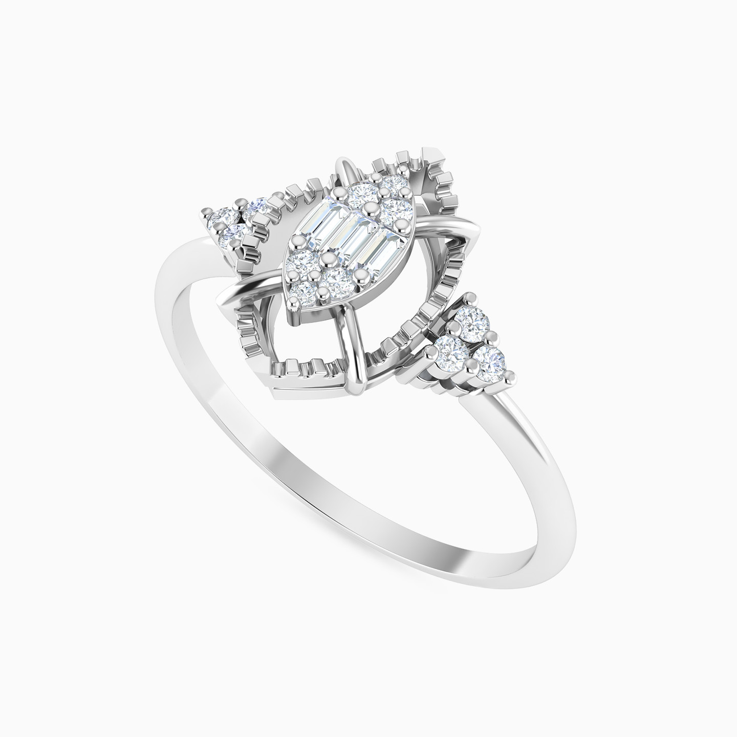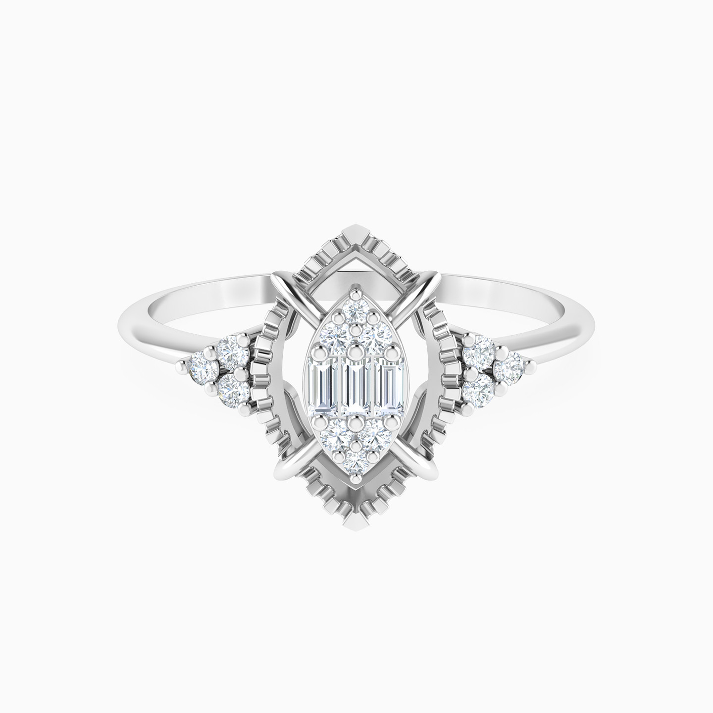 Add a touch of minimal sparkle to your everyday ensemble with this 18-karat white gold ring from L'azurde Diamonds. The thin band gracefully leads to a marquise-shaped frame, featuring ribbed textures and cradling a dazzling marquise-shaped motif adorned with brilliant and baguette-cut diamonds. Flanking this centerpiece are triangles of three brilliant-cut diamonds each, set on bar prongs, ensuring sparkle from every angle. This ring can take you from a workday to night out in town with ease!