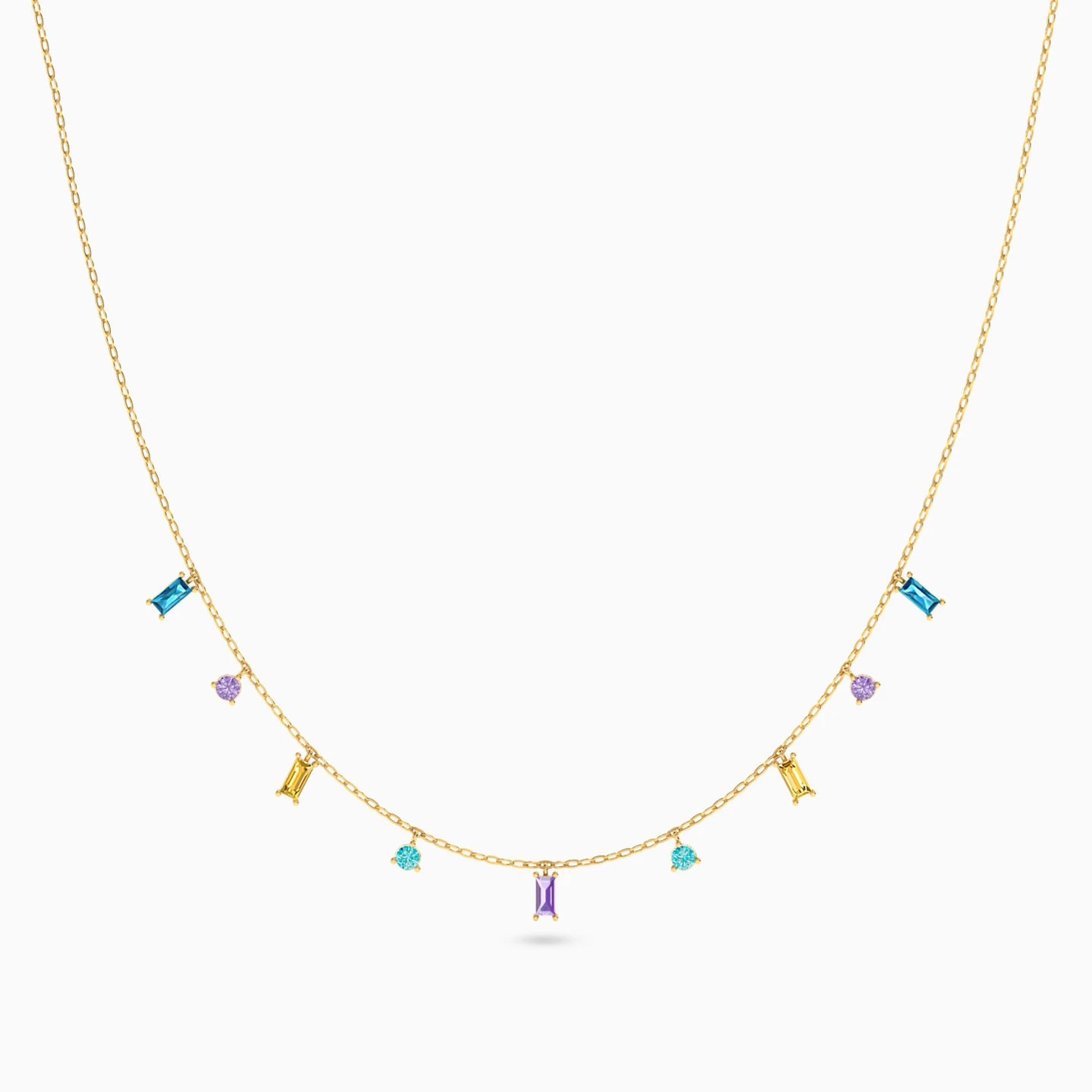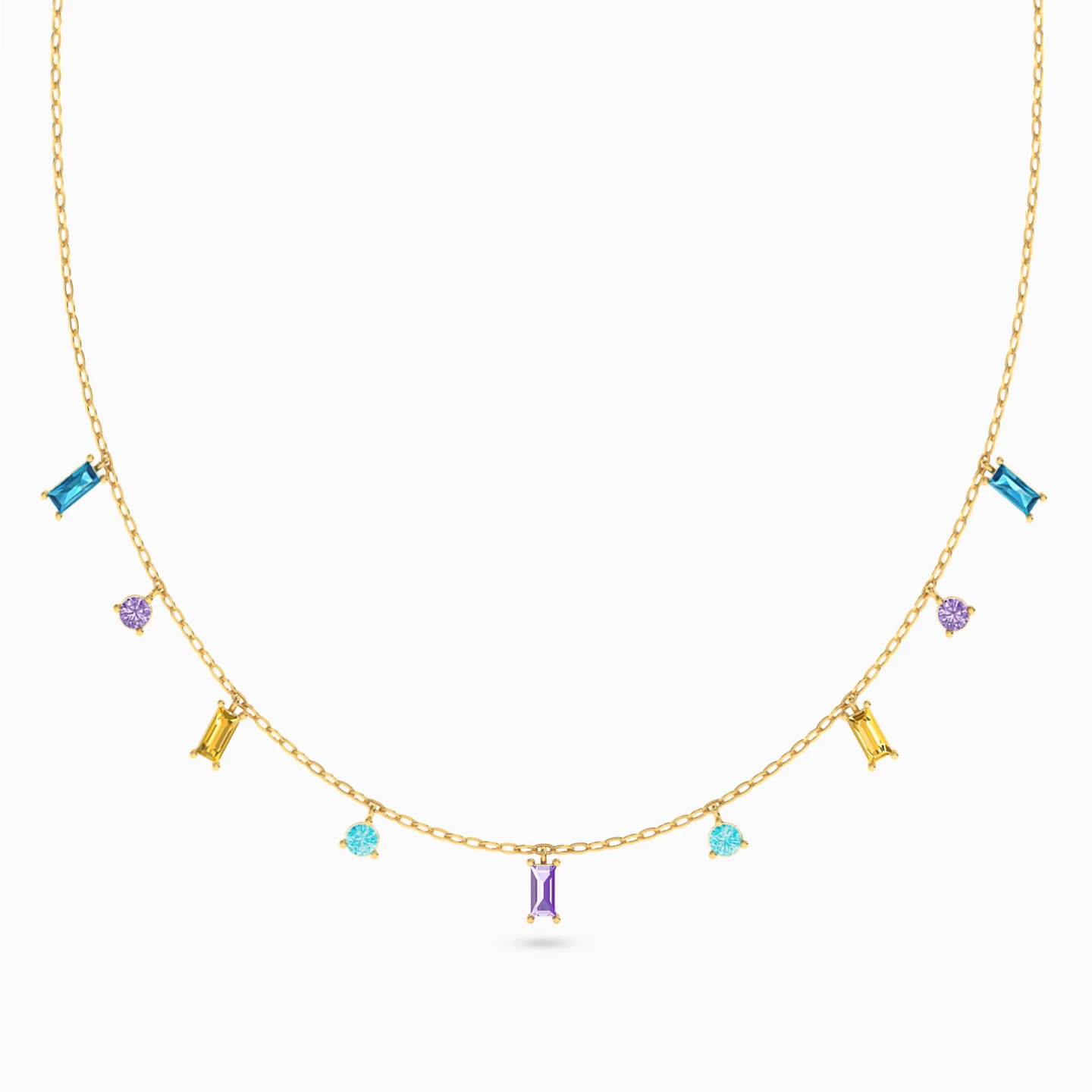 Bring about a colorful sparkle to your look with this stones necklace from Miss L’. The petite multicolored baguette and round shaped stones line up on the dainty 18-karat yellow gold chain, adding a subtle style appeal. Wear this over your day to evening outfits on its own, or layered with other chains.