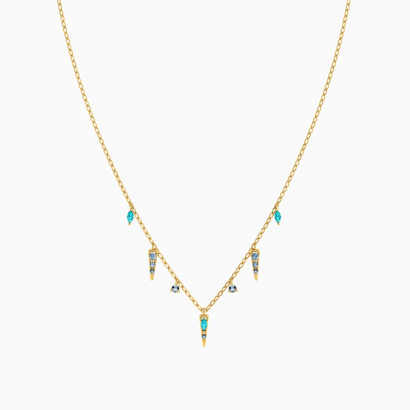 Get your shine on with this sparkling number from Miss L'. The perfect choice for a festive occasion, this necklace is designed with an 18-karat yellow gold chain and petite stone charms that dangle to the center. Wear it over a round or V-neckline for maximum effect.