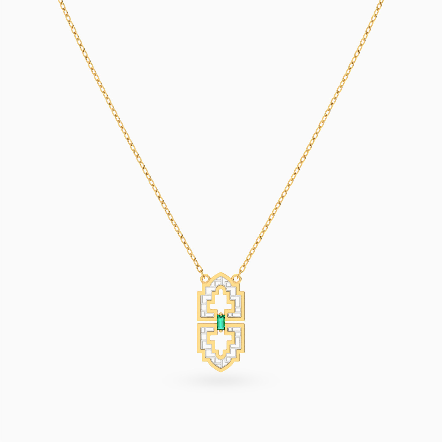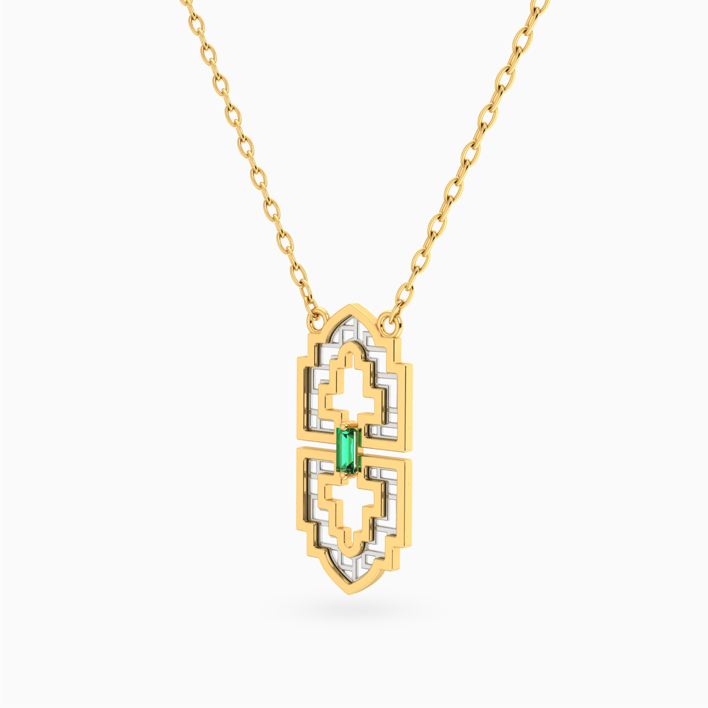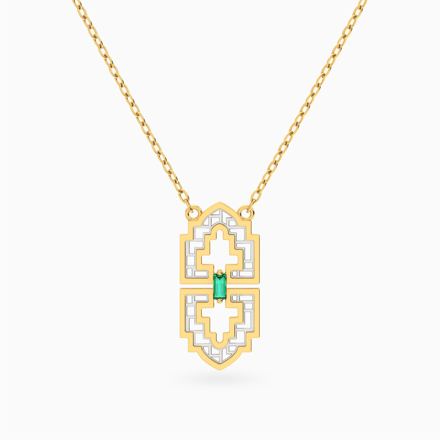 A modern twist on timeless design. This Instyle necklace from the Arabesque Collection showcases a bold geometric pendant with intricate cut-out motifs, crowned at the center by a green square stone that adds depth and vibrancy. A sophisticated gift that blends cultural artistry with contemporary style.