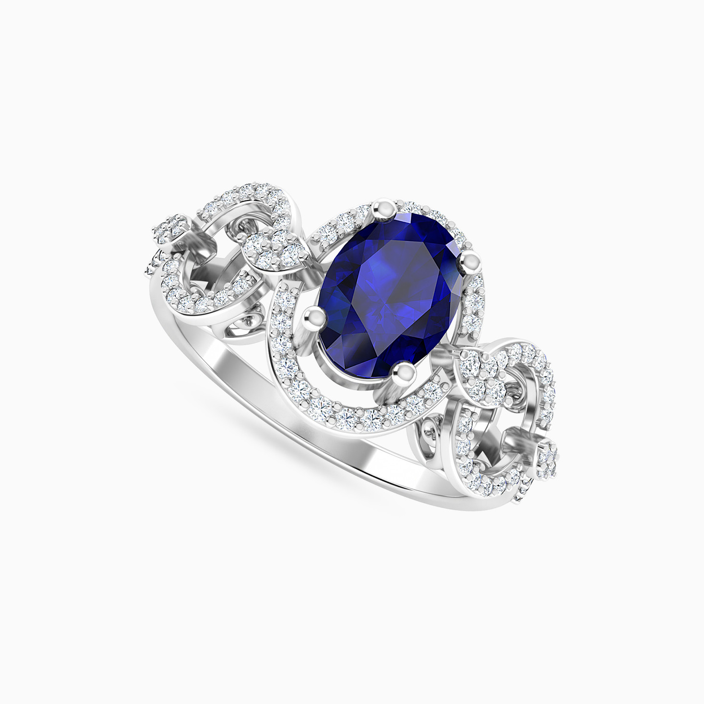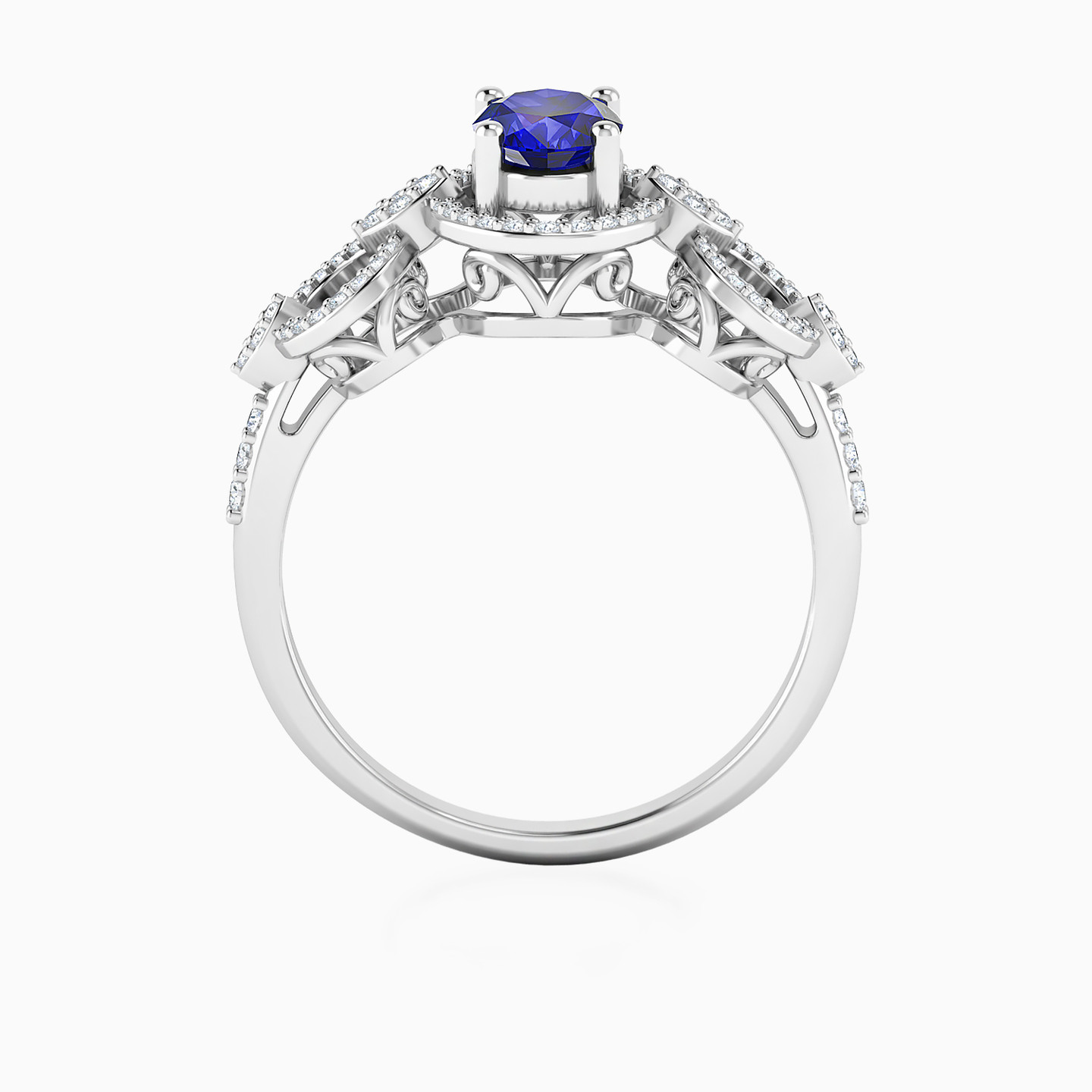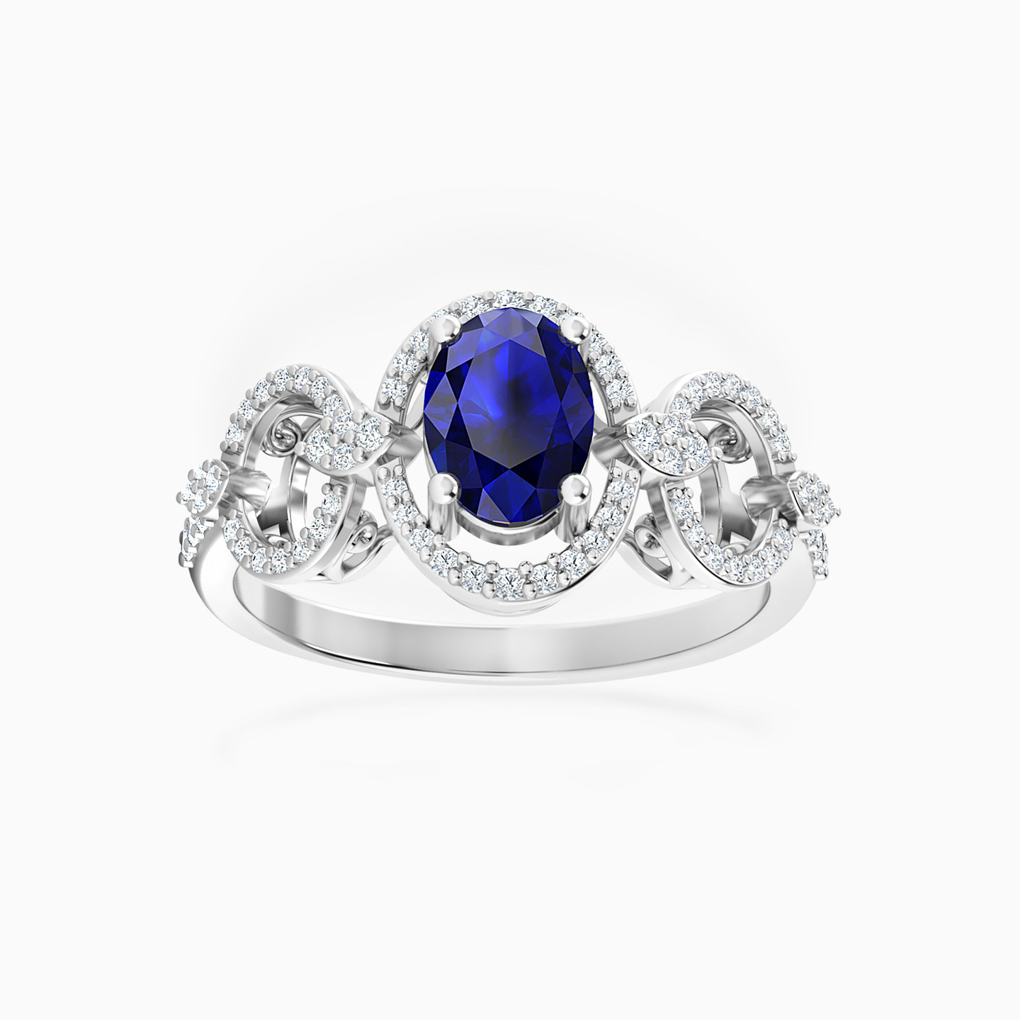 Royalty has a new name! This stunner from L'azurde Diamonds is our latest addition to the royal collection. It features three oval-shaped frames lined with sparkling diamonds and nestled in the center of the frame is the most regal and dazzling oval-shaped blue stone you have ever seen. All of this is complemented by the 18-karat white gold body. Wear this ring with a royal blue bodycon dress for your next party.