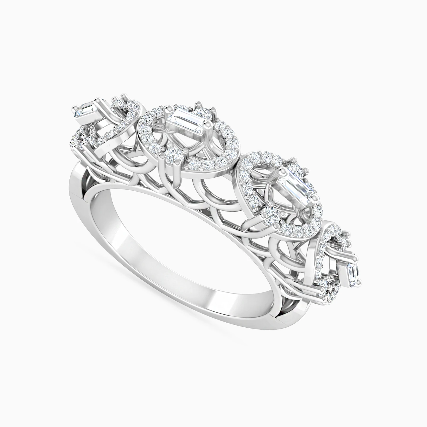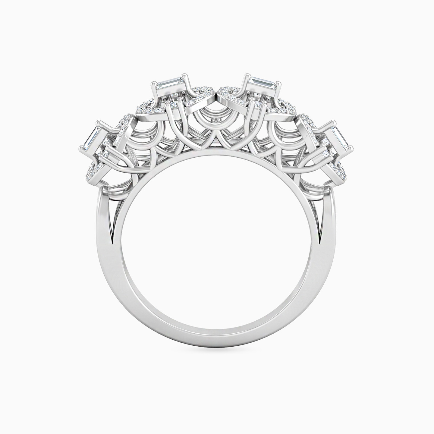 Dazzling oval-shaped halos studded with brilliant cut diamonds sit beautifully on an intricately crafted open frame design of this stunning statement ring by L'azurde Diamonds. Crafted from 18-karat white gold, this ring is all you need to add that touch of elegance and style to your everyday outfit. Please note: This ring is sold without the center diamond stone.