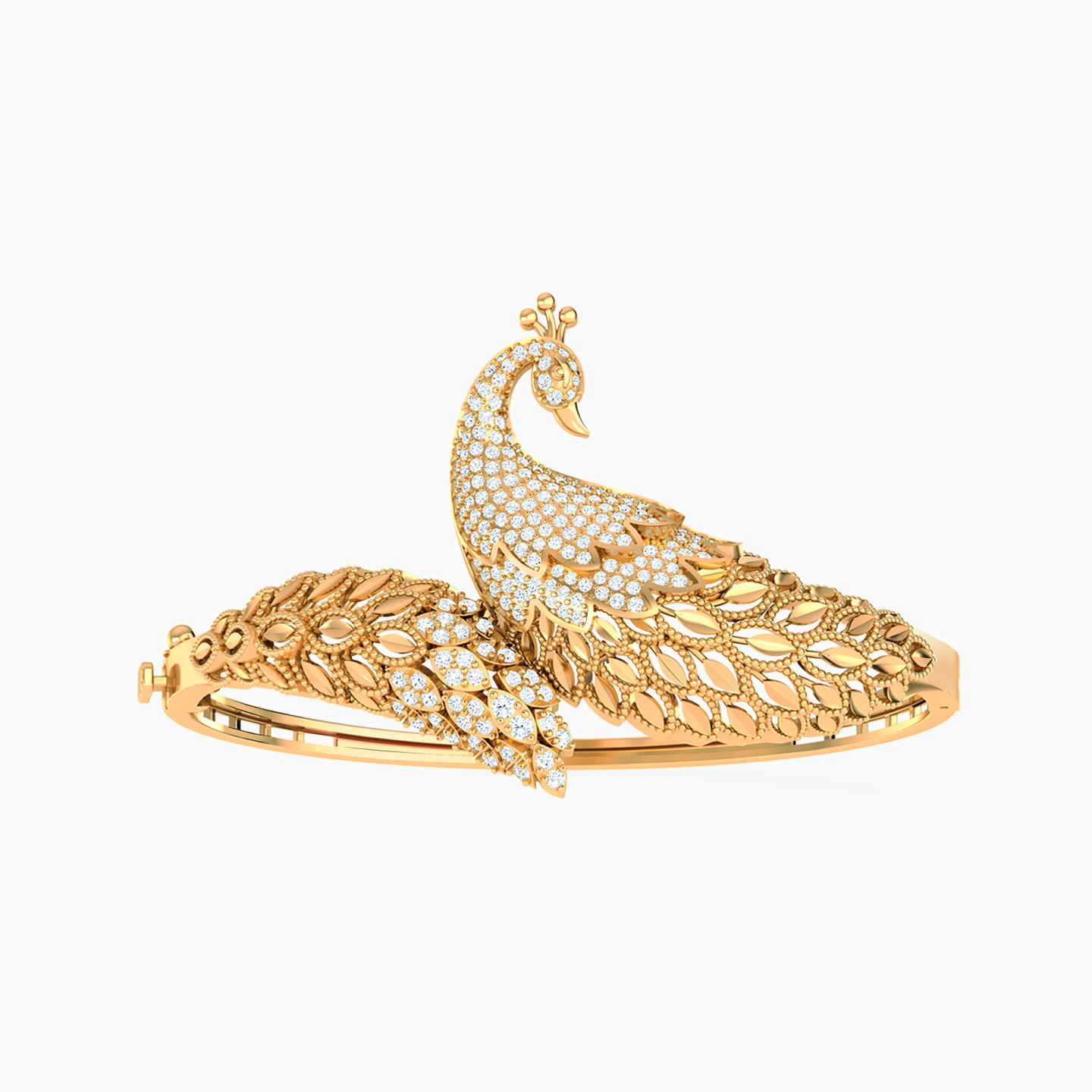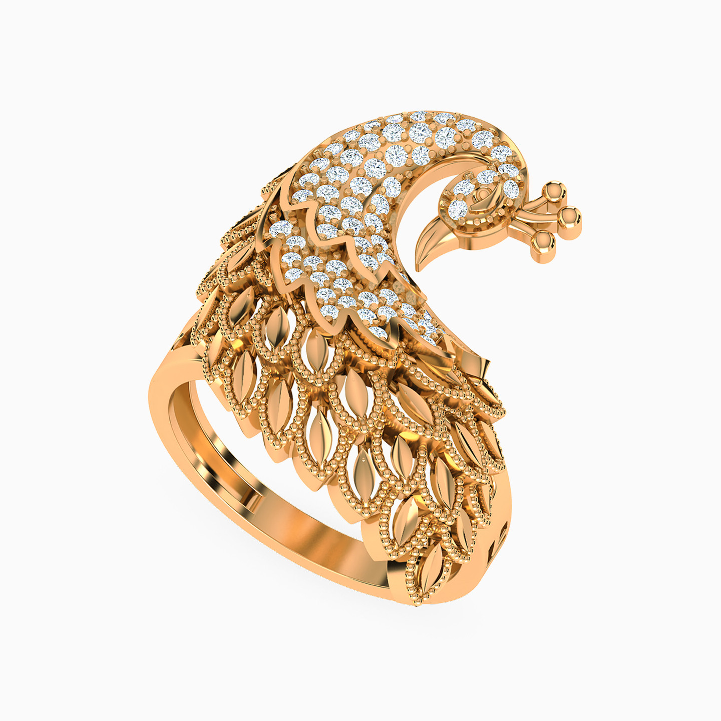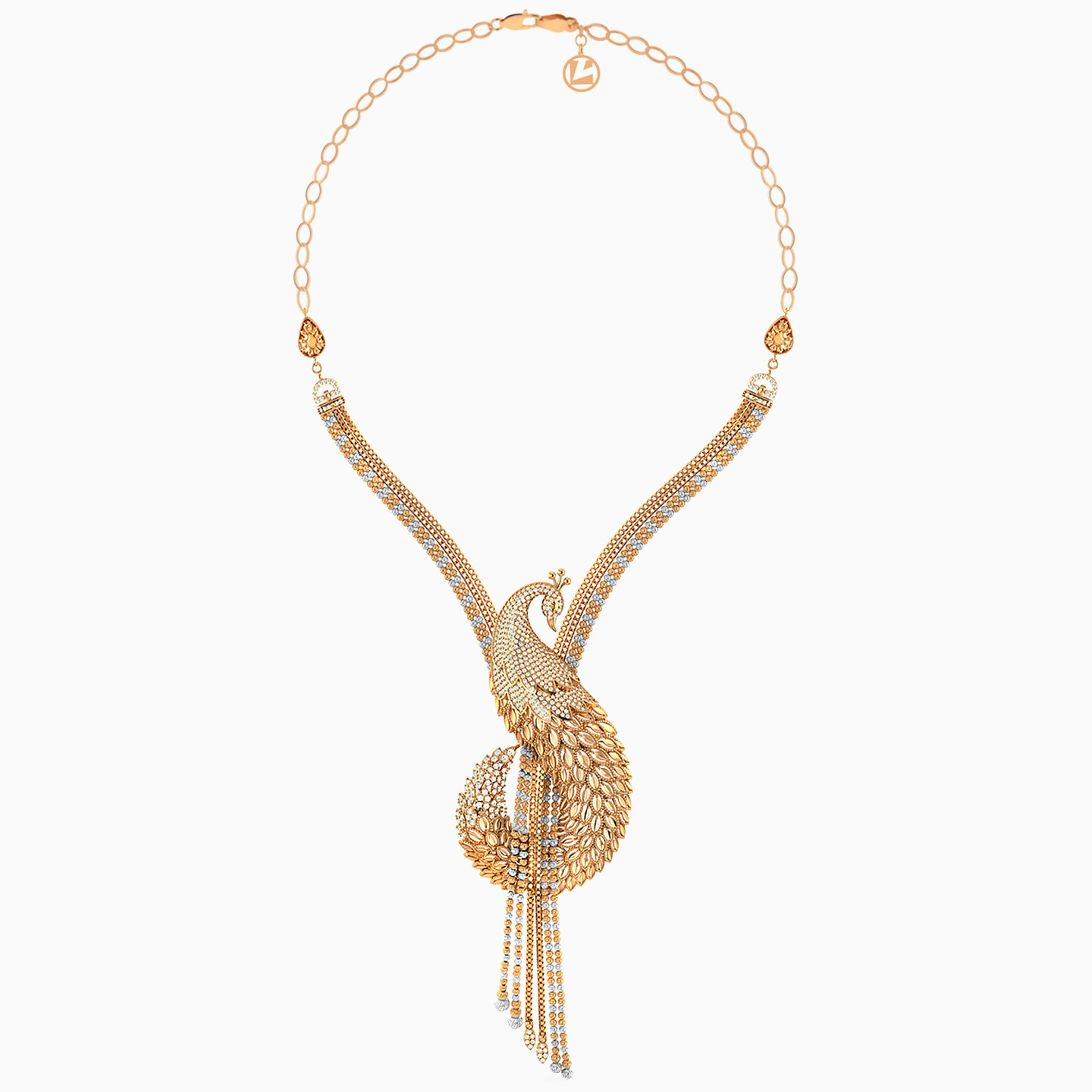 This 21-karat yellow gold jewelry set from L'azurde Gold includes a captivating trio of a chain necklace, a bangle bracelet, and a charming ring. At the heart of each piece is a stunning peacock, intricately crafted and with a head studded with glistening cubic zirconia. The necklace showcases layers of white and yellow gold beads forming an elegant chain, with dangles flowing from the peacock's majestic plumage. Meanwhile, the bracelet adds a unique twist with the beautiful peacock embracing your wrist as a symbol of grace and charm. This set is a true embodiment of sophistication and is the perfect choice for those who appreciate the beauty of nature and seek to make a regal statement with their jewelry.