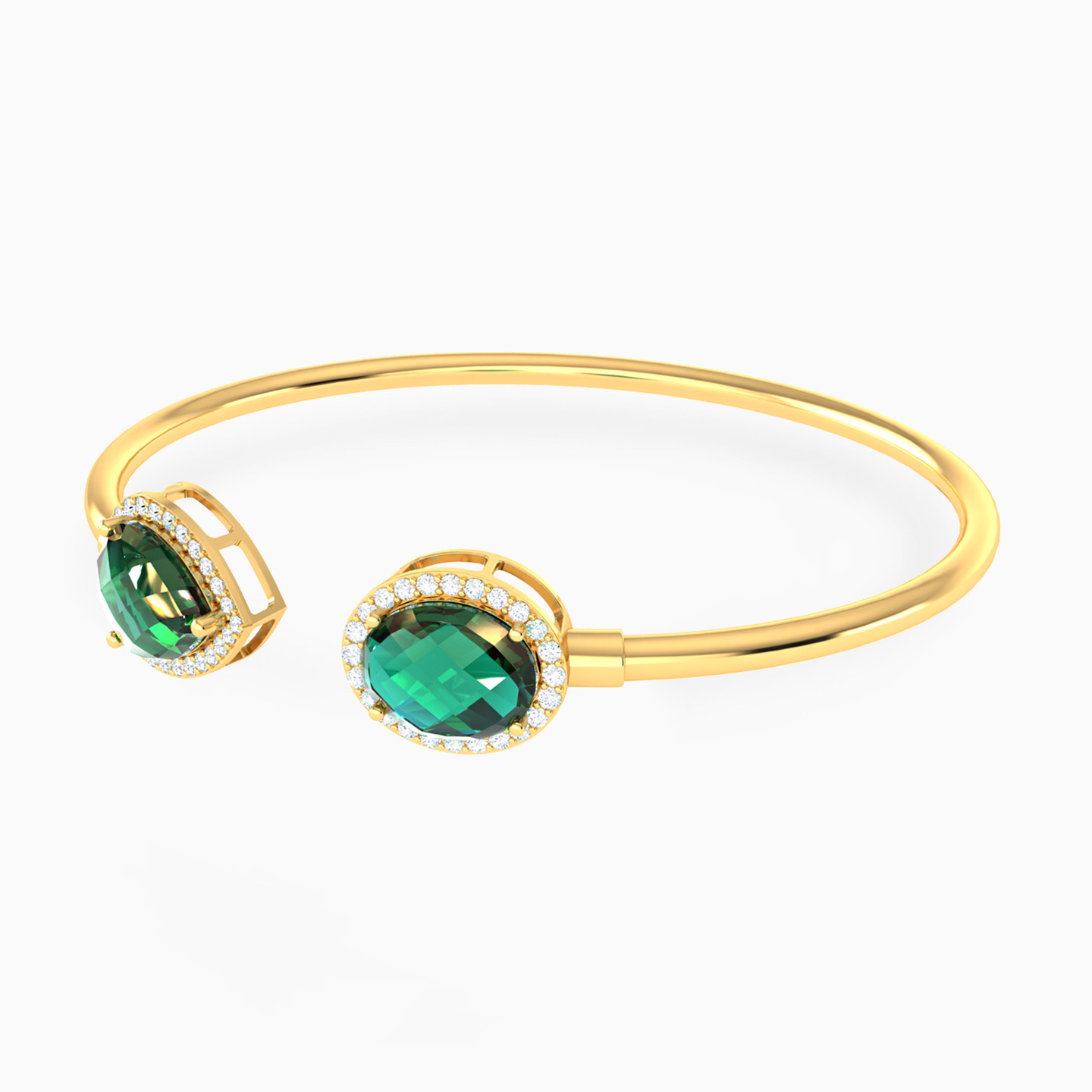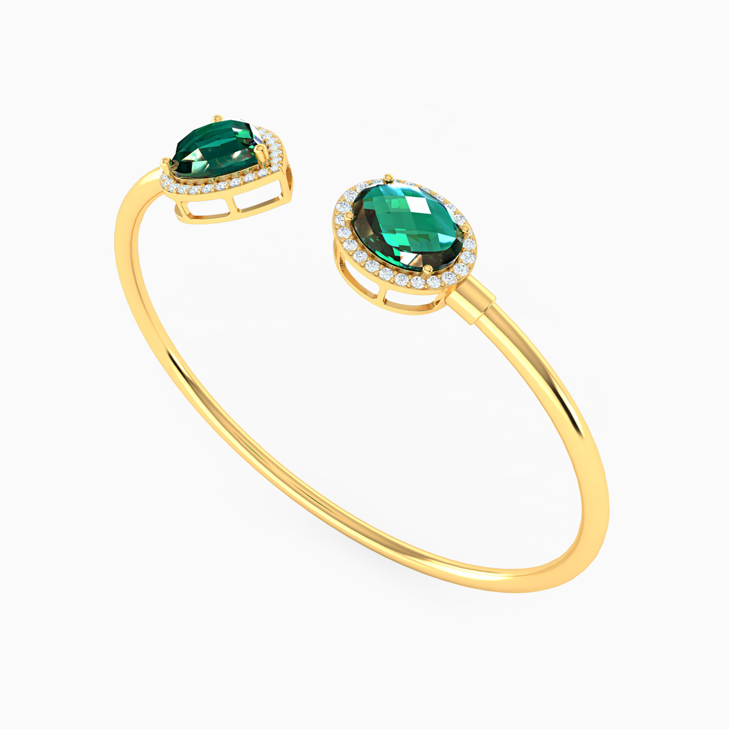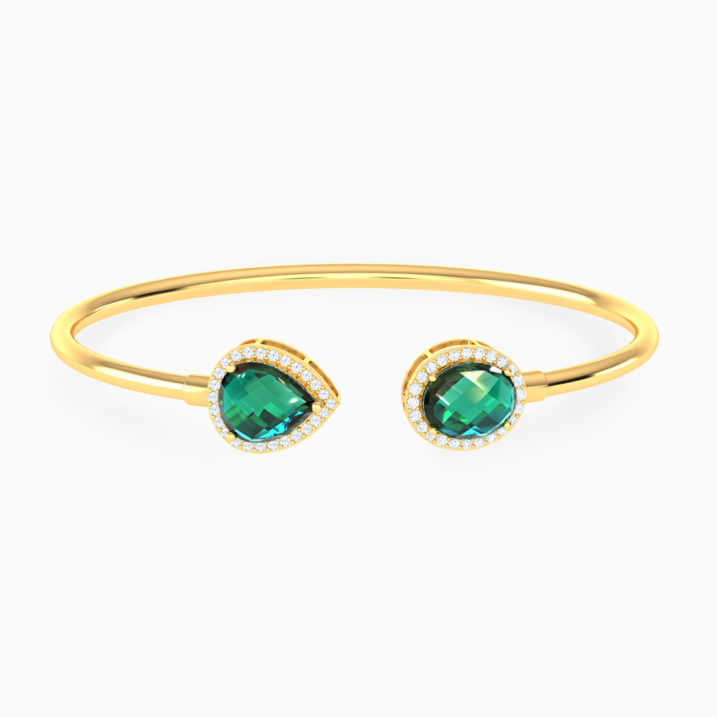 A duet of deep color and brilliance. This Lazurde Gold open cuff bracelet features two teardrop-shaped & oval-shaped green stones, each surrounded by pavé-set cubic zirconia for a glowing contrast. A refined piece that radiates bold elegance with every glance.