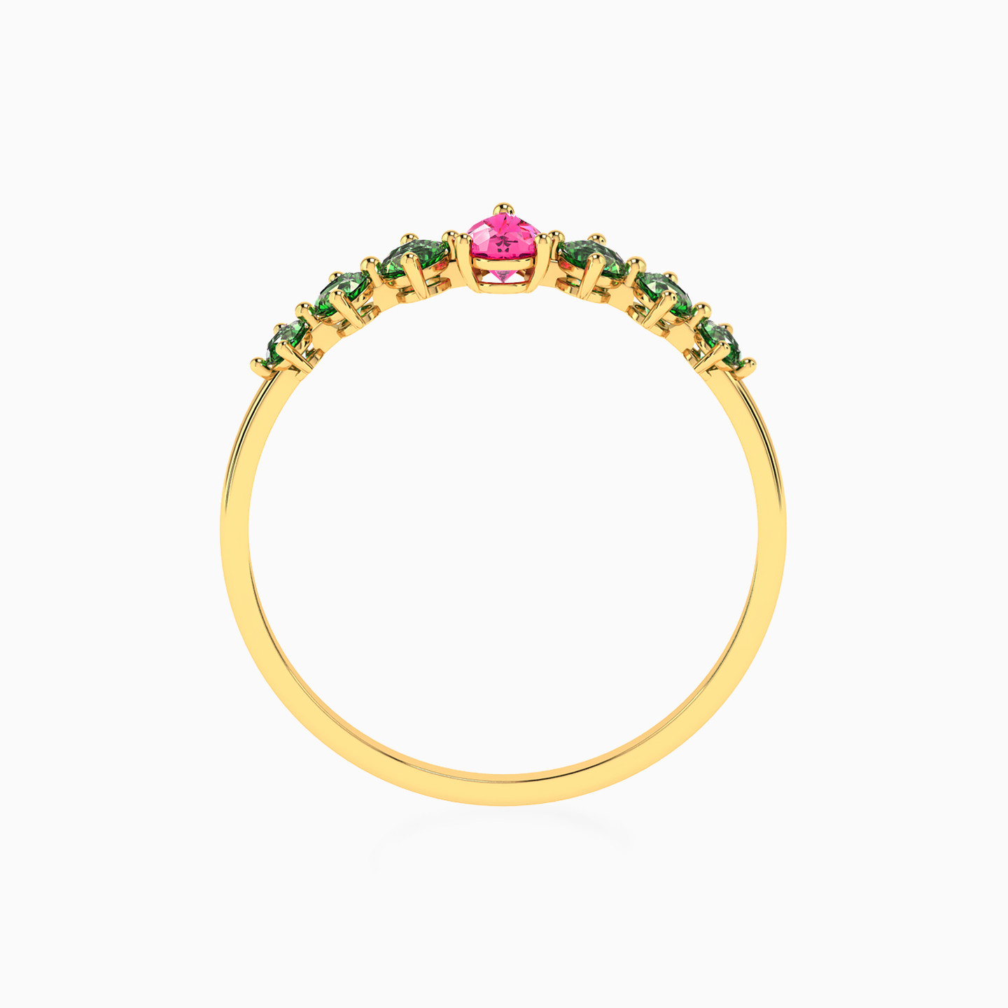 Prepare for admiring glances when wearing this eye-catching colored stones ring on your finger. Adorning this gleaming 14-karat yellow gold ring from Instyle is a stunning row of round green colored stones and a teardrop-shaped fuchsia stone at the center providing a vibrant and sophisticated touch. The elegant shape and feminine design of this ring add to its mesmerizing beauty. We suggest pairing this stunning piece with the matching drop earrings, bracelet and pendant necklace to elevate any outfit.