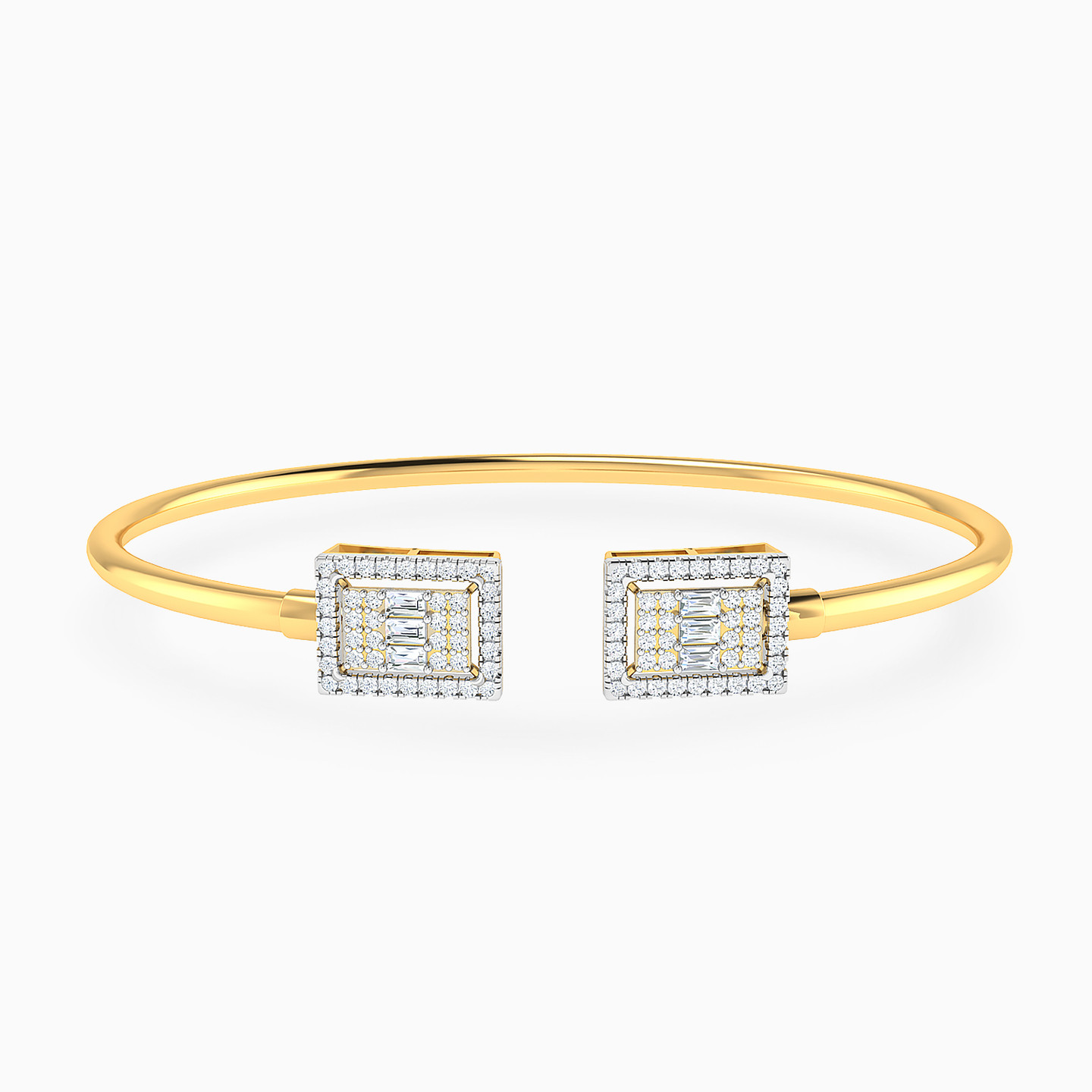 Invest in timeless elegance with this exquisite piece from Lazurde Gold! This sophisticated yellow gold cuff bracelet features rectangular layered shapes on each end, meticulously studded with small clear stones. The balanced design combines bold structure with delicate sparkle, creating a refined accessory that enhances your wrist with modern luxury and timeless charm.