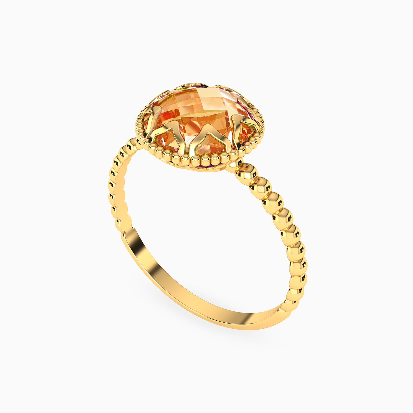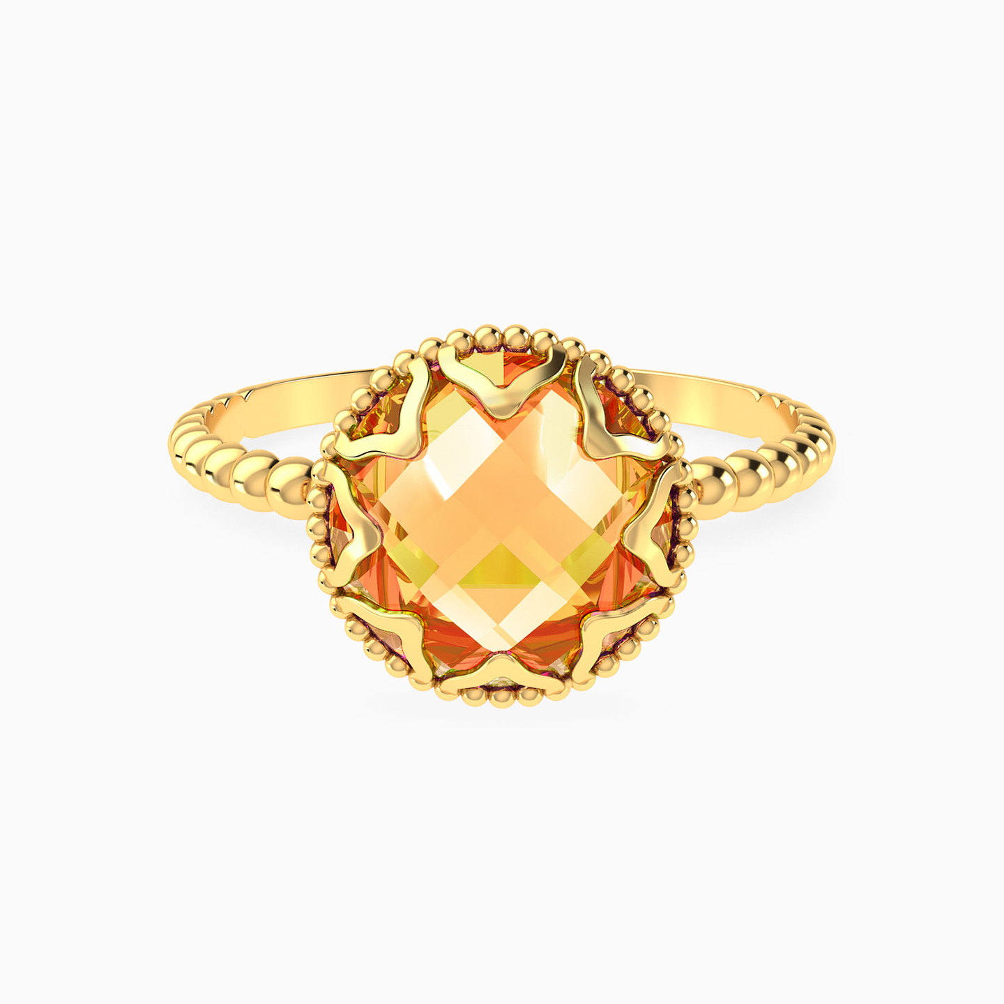 Royalty has a new name! This statement ring by L'azurde Instyle features a beautiful gold beads band and a stunning round-shaped colored stone center that is highlighted by a delicate wildflower frame. Crafted from 18-karat yellow gold, this ring is suited for both day and evening wear.