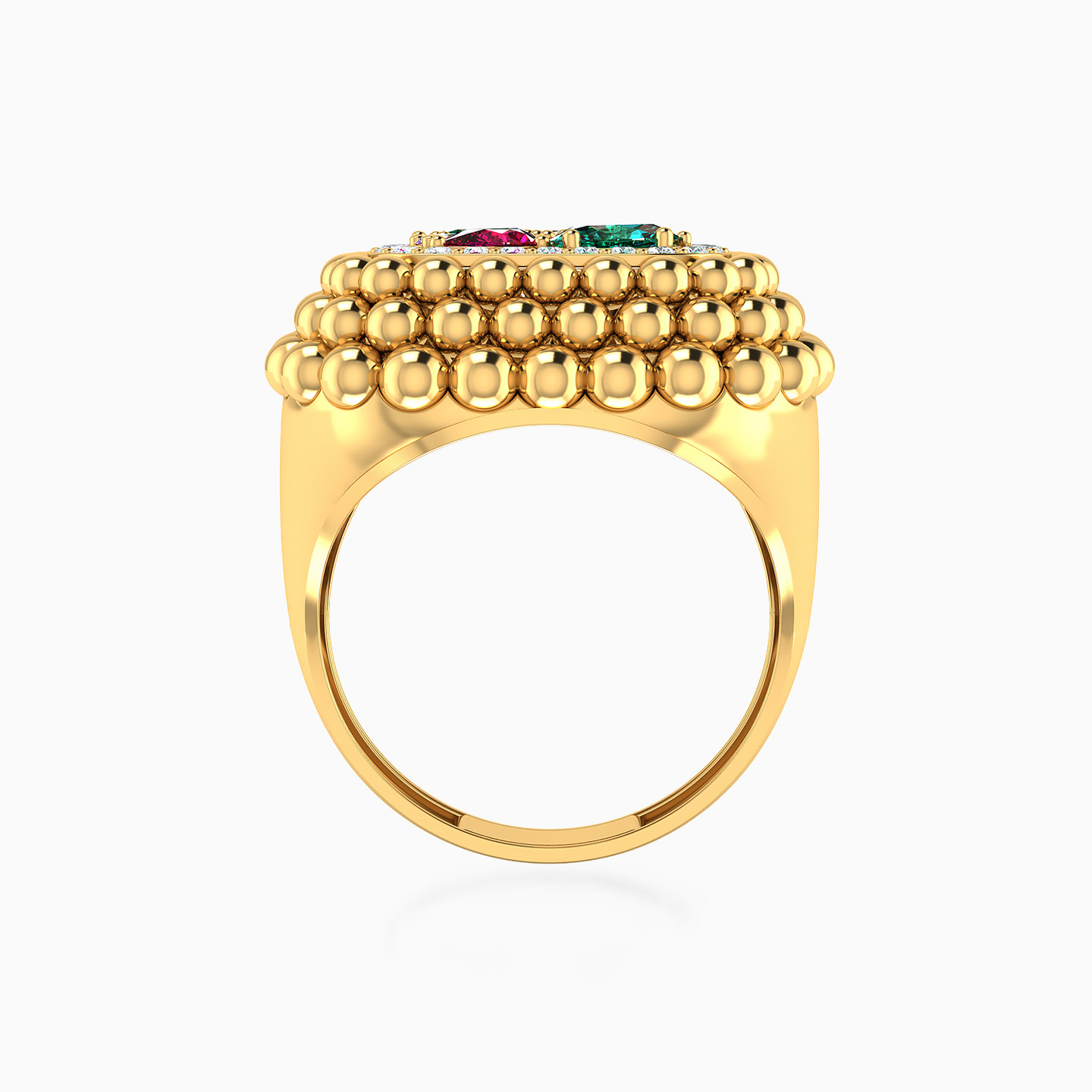 Add color and style to your look with this gorgeous square ring from L'azurde Gold. Beautifully crafted in 18-karat yellow gold with stunning bead detailed, rounded edges and multi-shaped colored stones at the center, this statement making ring is a must-have for elegant evenings and chic dinner parties. We suggest wearing this ring with a little black dress and chic gold dangle earrings for a look that captures attention.