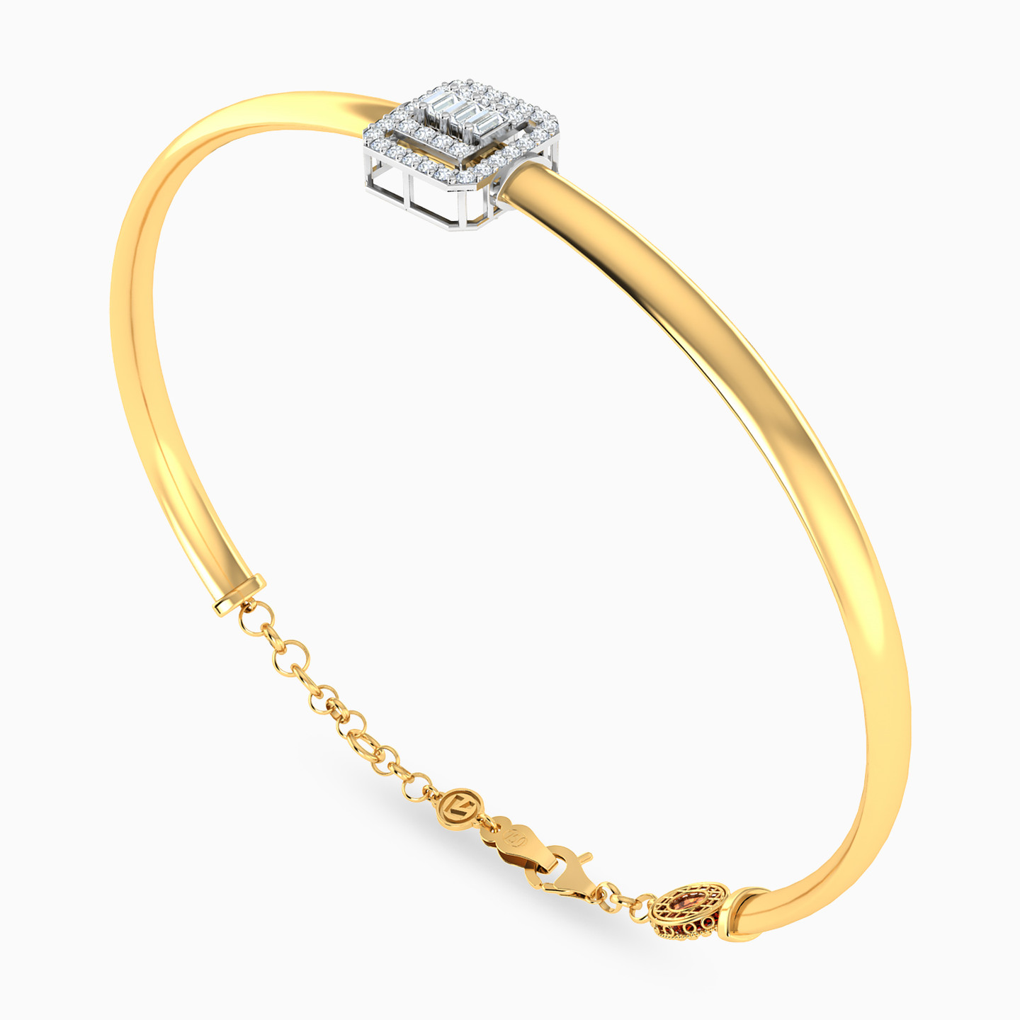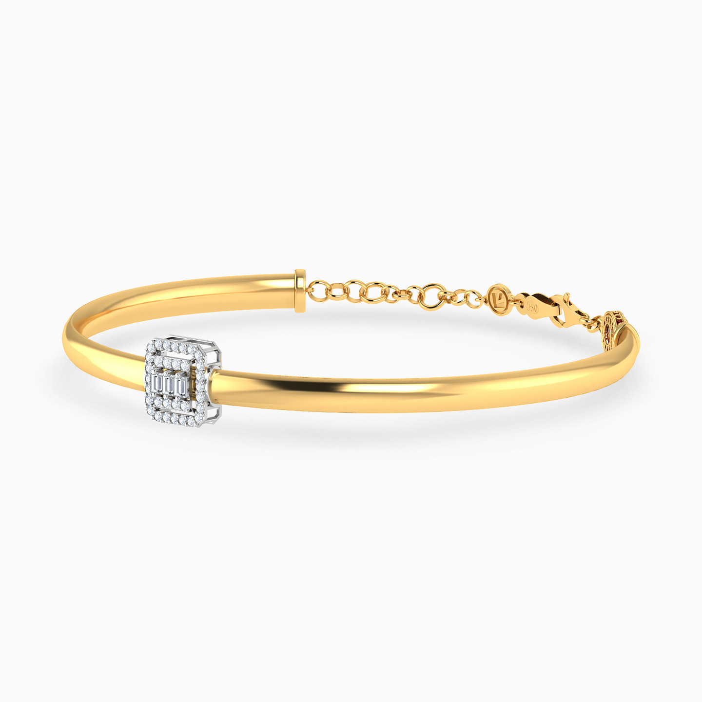 Dress your wrist in a disco ball of delight with this 18-karat yellow gold bangle bracelet from L'azurde Gold! The sleek bangle, boasting a mirror finish, leads to the main event - a square-shaped motif at the center. This showstopper is bedazzled with a mix of baguette and round cubic zirconia, framed by an outer square made entirely of sparkling round cubic zirconia because you deserve to be the star of every gathering! Style this beauty with a minimal chain necklace for an elegant look.