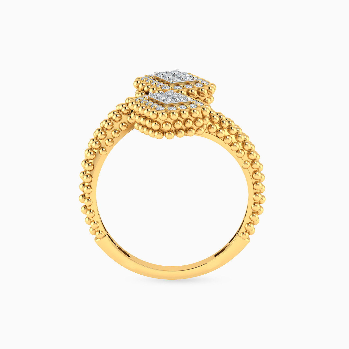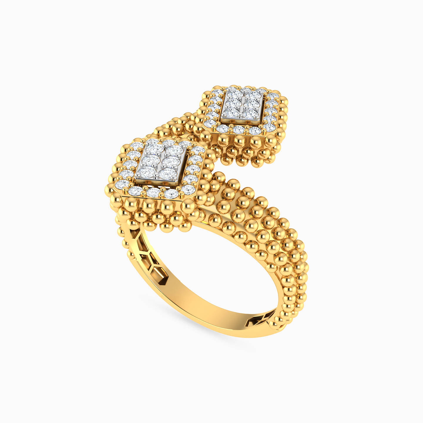Dazzle and sparkle everywhere you go with this exquisite 18-karat yellow gold two-headed ring from L'azurde Gold. The stunning band, adorned with yellow gold beads that resemble studs, adds a touch of sophistication and edge to this striking piece. Each head boasts a captivating rectangle-shaped motif, adorned with round-shaped cubic zirconia nestled within a radiant cubic zirconia studded frame lined with round gold beads, making this ring the perfect choice for adding a touch of opulence and sparkle to any ensemble.