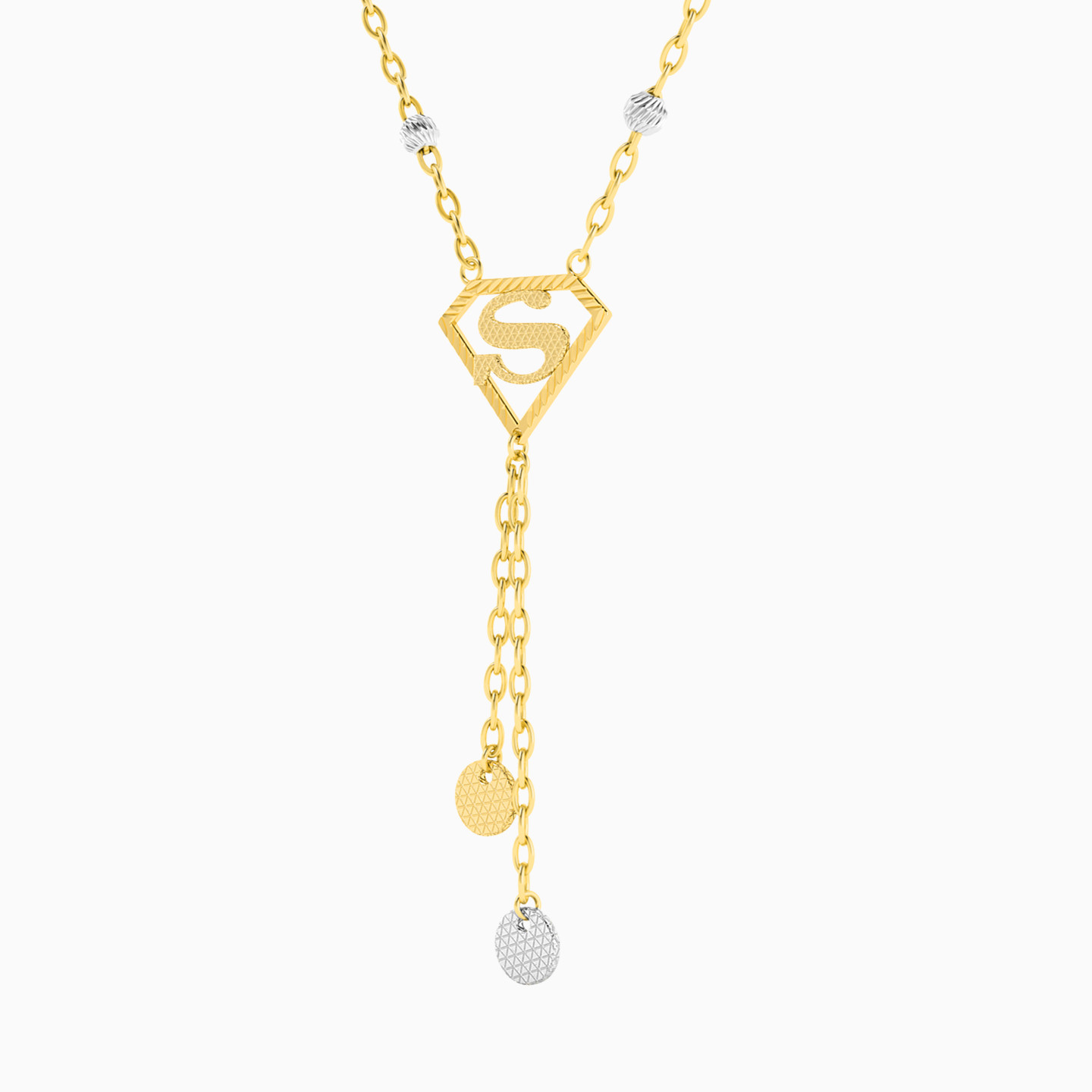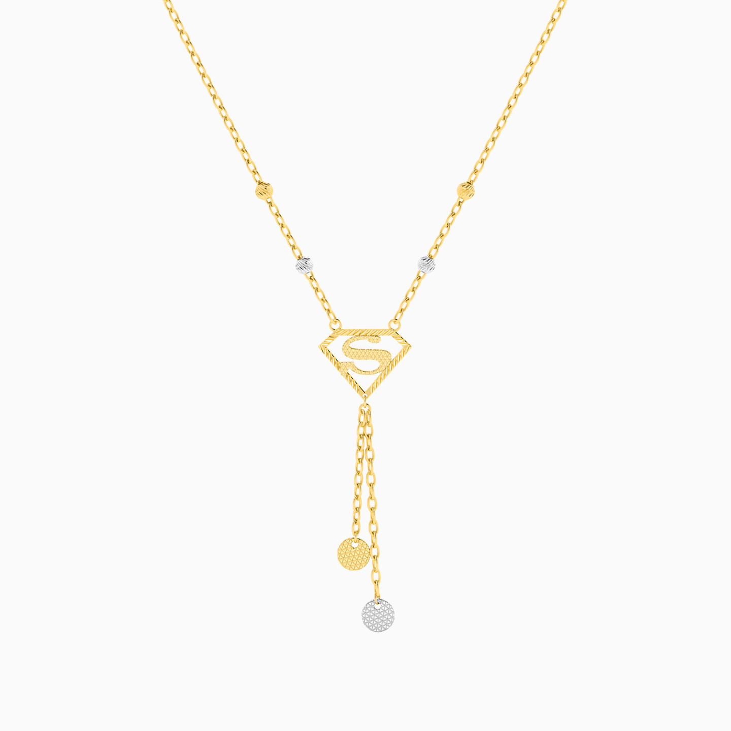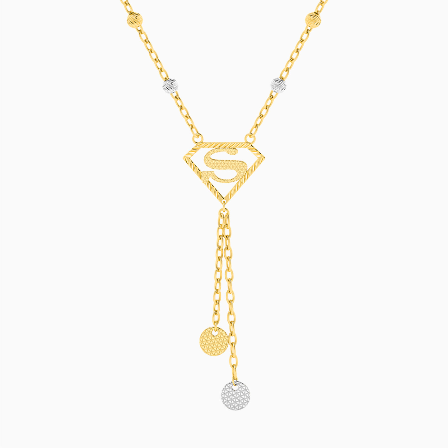 Strength makes a stylish appearance with this necklace from Miss L’. We love the two-tone construct and the shiny superwoman logo that drops into petite dangles. A great choice of collectible for a fan, this piece also makes a lovely gift to celebrate strength and resilience.