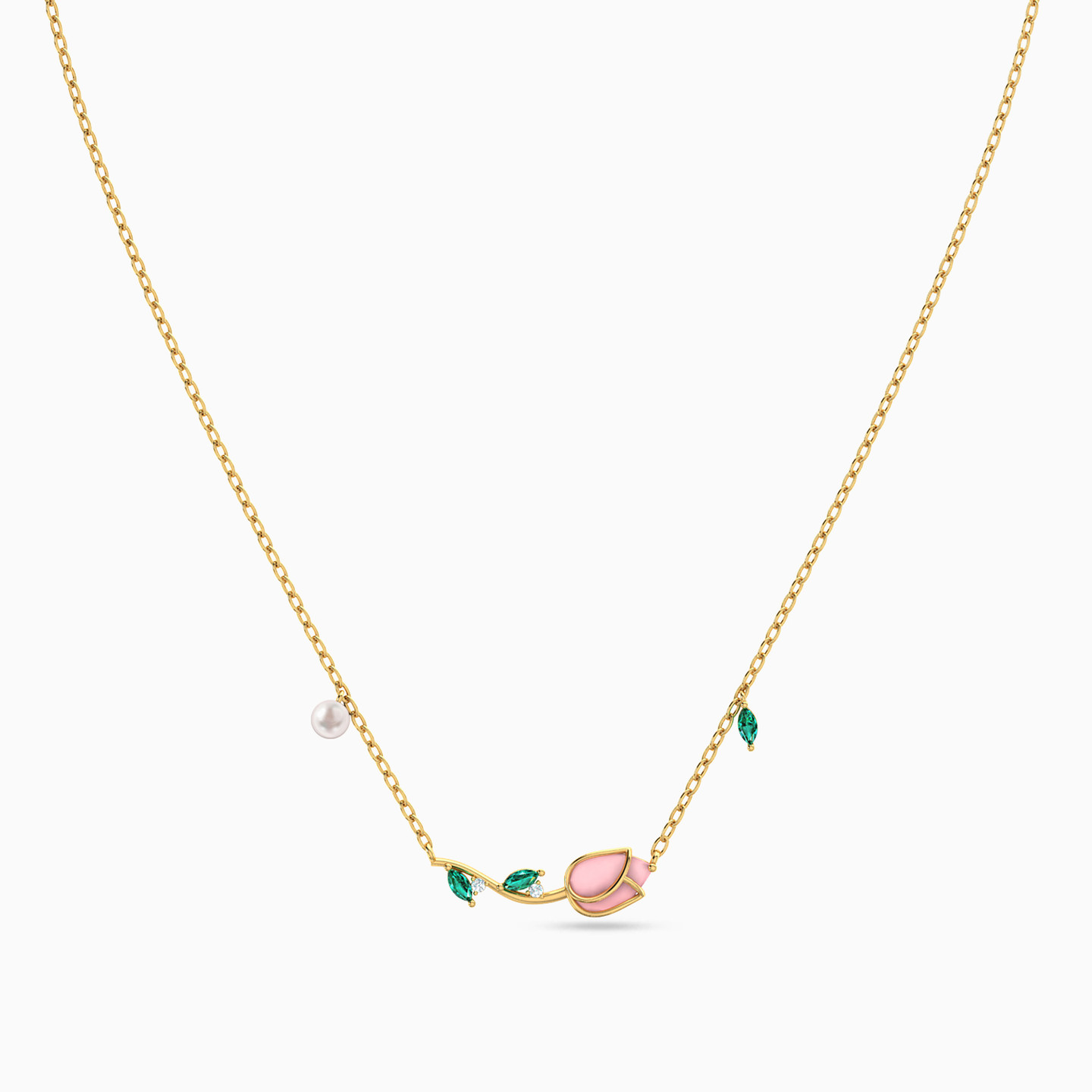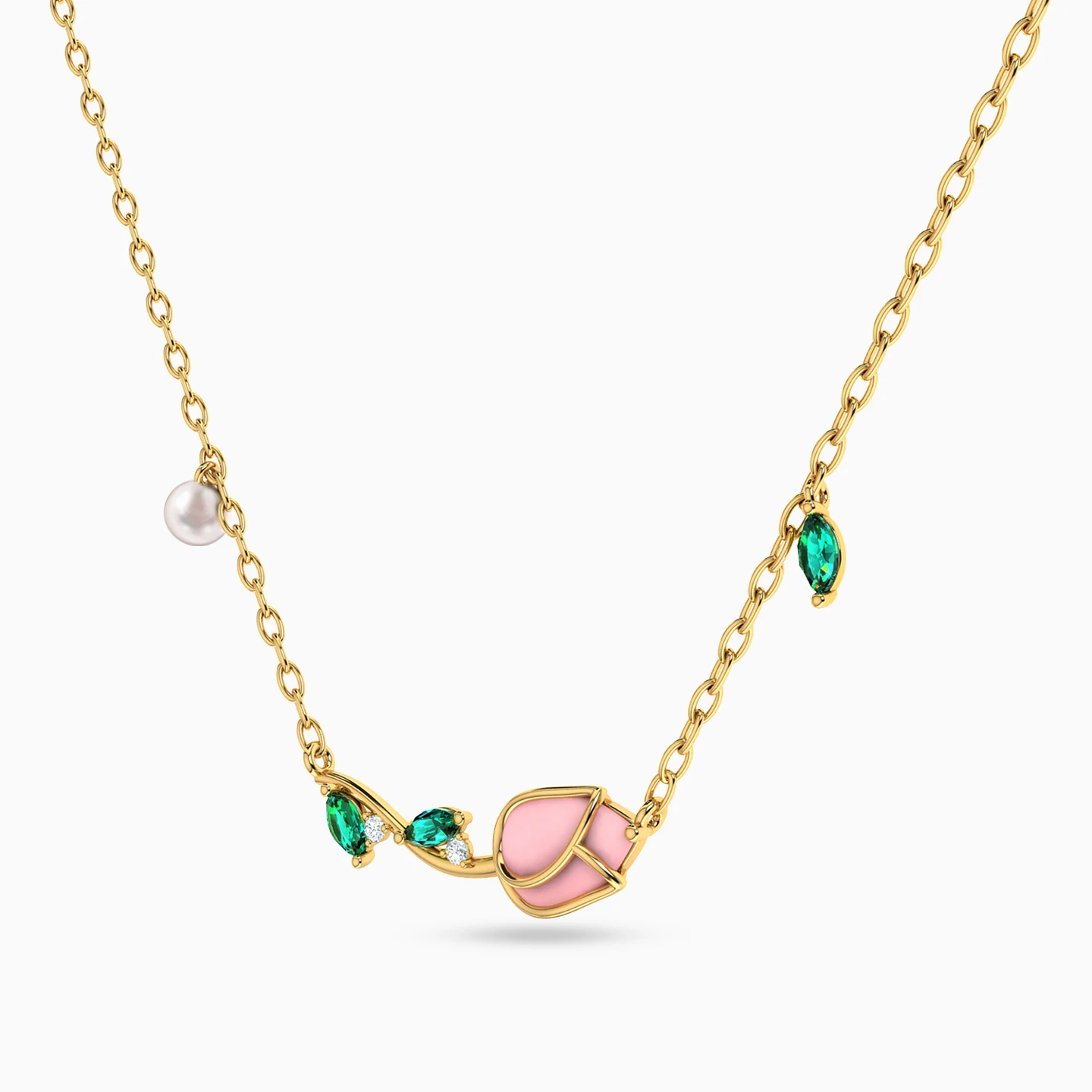 Pick the prettiest flower from L'azurde Instyle to add to your jewelry collection. This elegant yellow gold pendant necklace showcases a rose blossom crafted in pink colored stone and eye-catching marquise-shaped emerald green stone petals. To add to its feminine allure, this gorgeous necklace features a pearl stone along one side of the chain, and a green-colored petal charm on the other. Petite cubic zirconia add to its beauty. You’ll feel feminine and sophisticated wearing this stunning piece.
