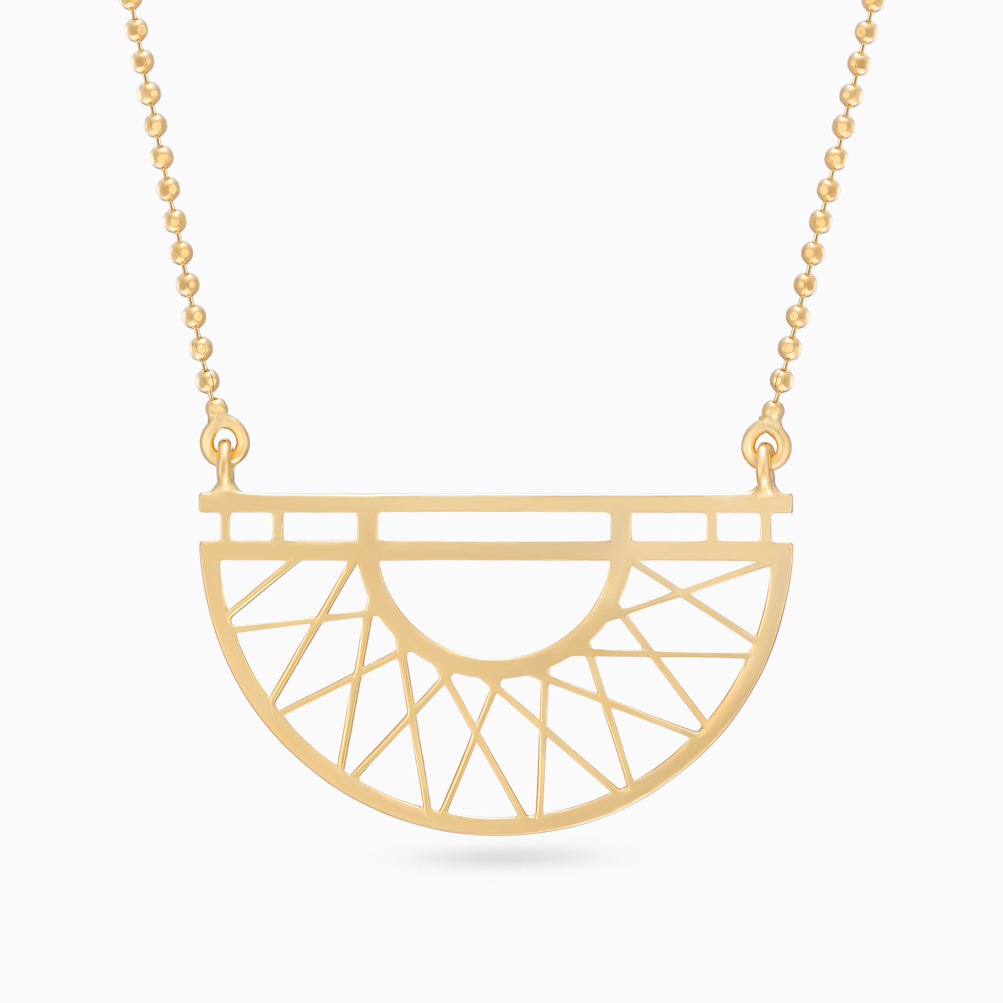 Say hello to modern elegance with this gorgeous pendant necklace from L'azurde Gold. Sharp lines and intricate artistry adorn a semi-circular pendant that anchors this 21-karat yellow gold pendant necklace. Style it with a plunging neck dress or top to show off this beauty!