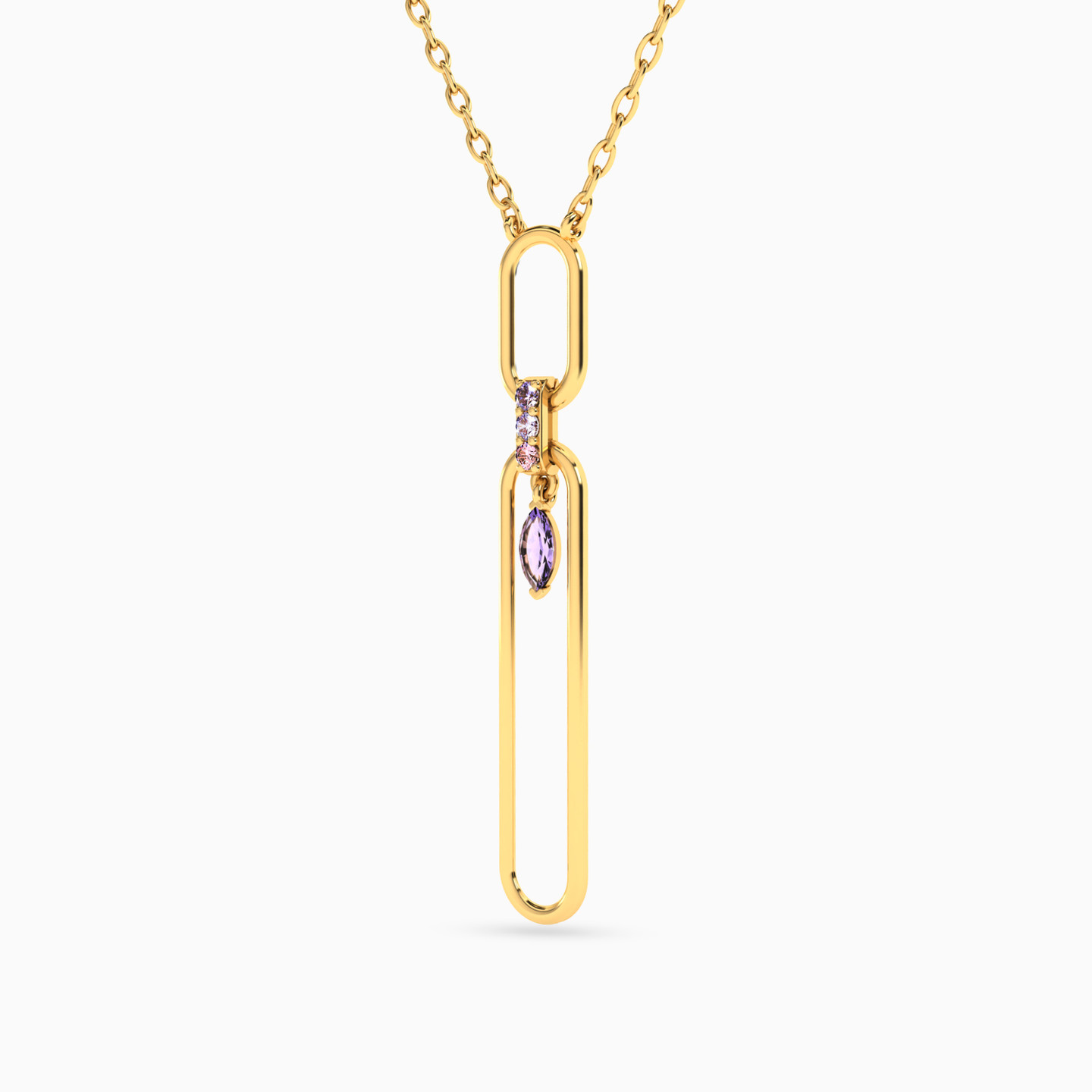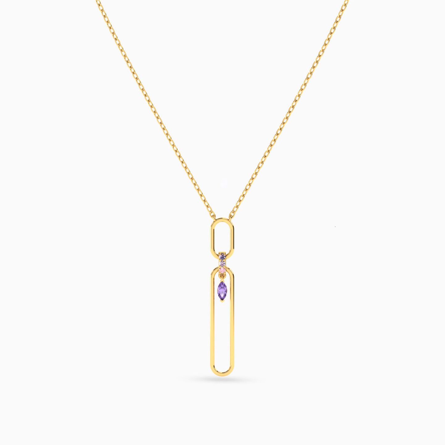Take your daytime and evening looks up a notch with this sophisticated 18-karat yellow gold necklace from Miss L’. Captivating golden links at the center of this pendant are dotted with dazzling accent stones and a dangling amethyst-colored stone which adds a brilliant pop of color to the design. This necklace is the perfect piece to transition from work day to date night with ease.