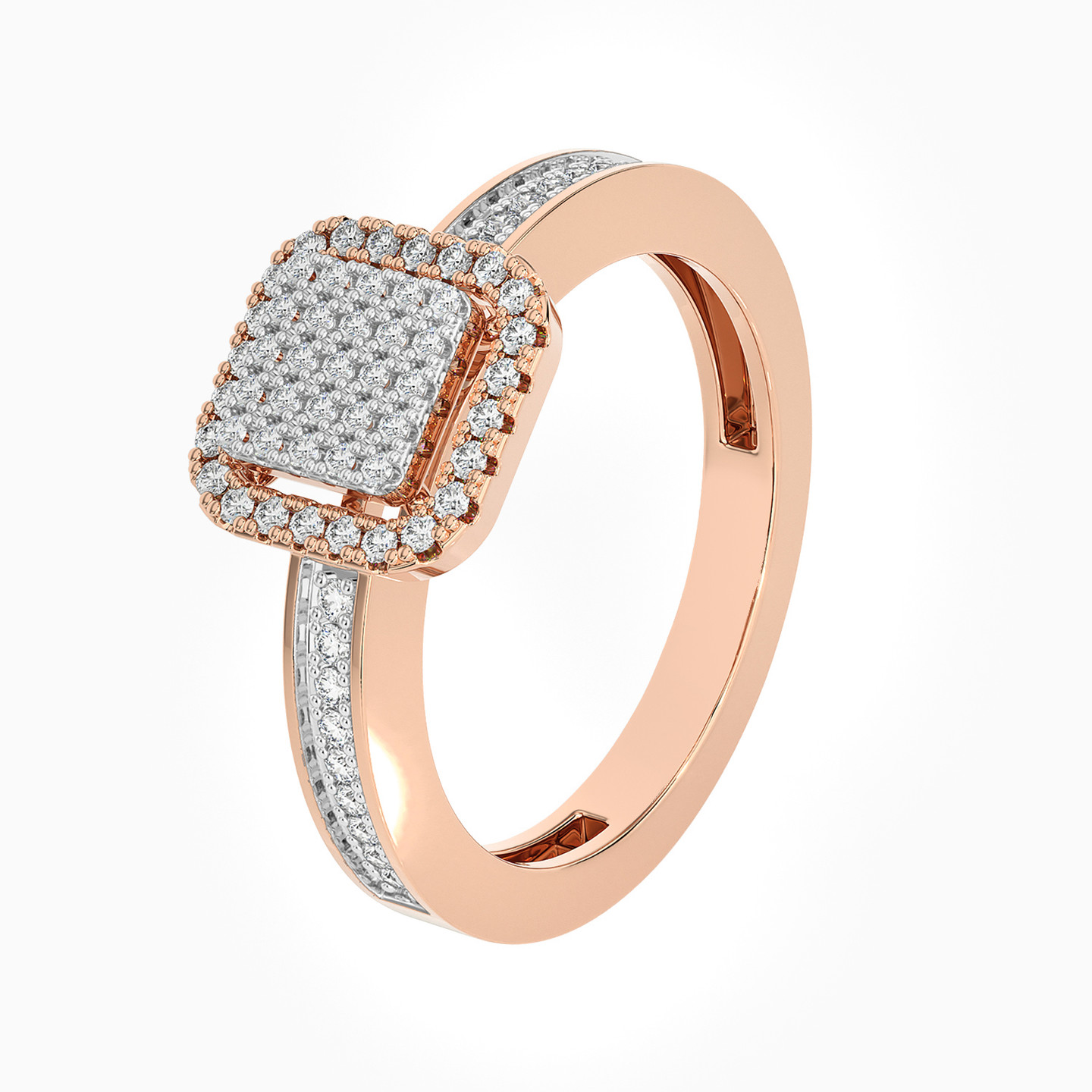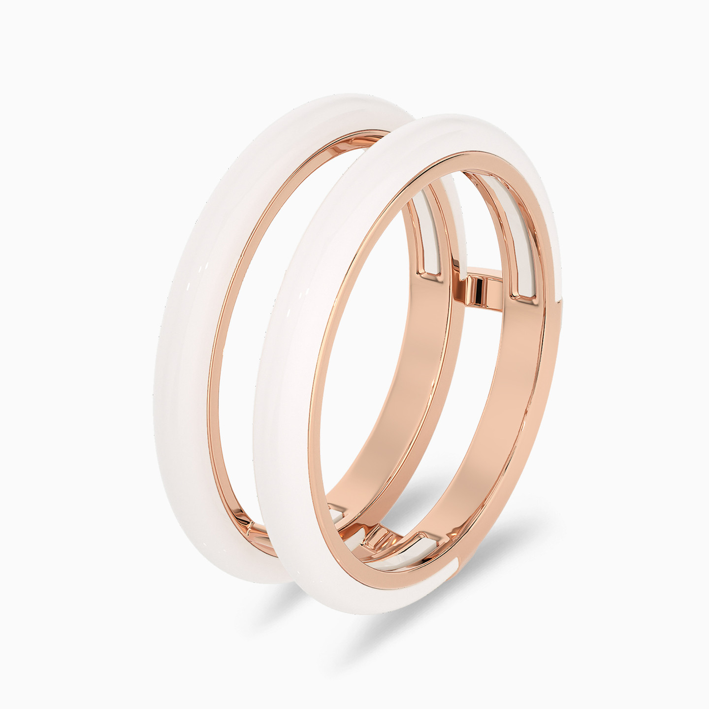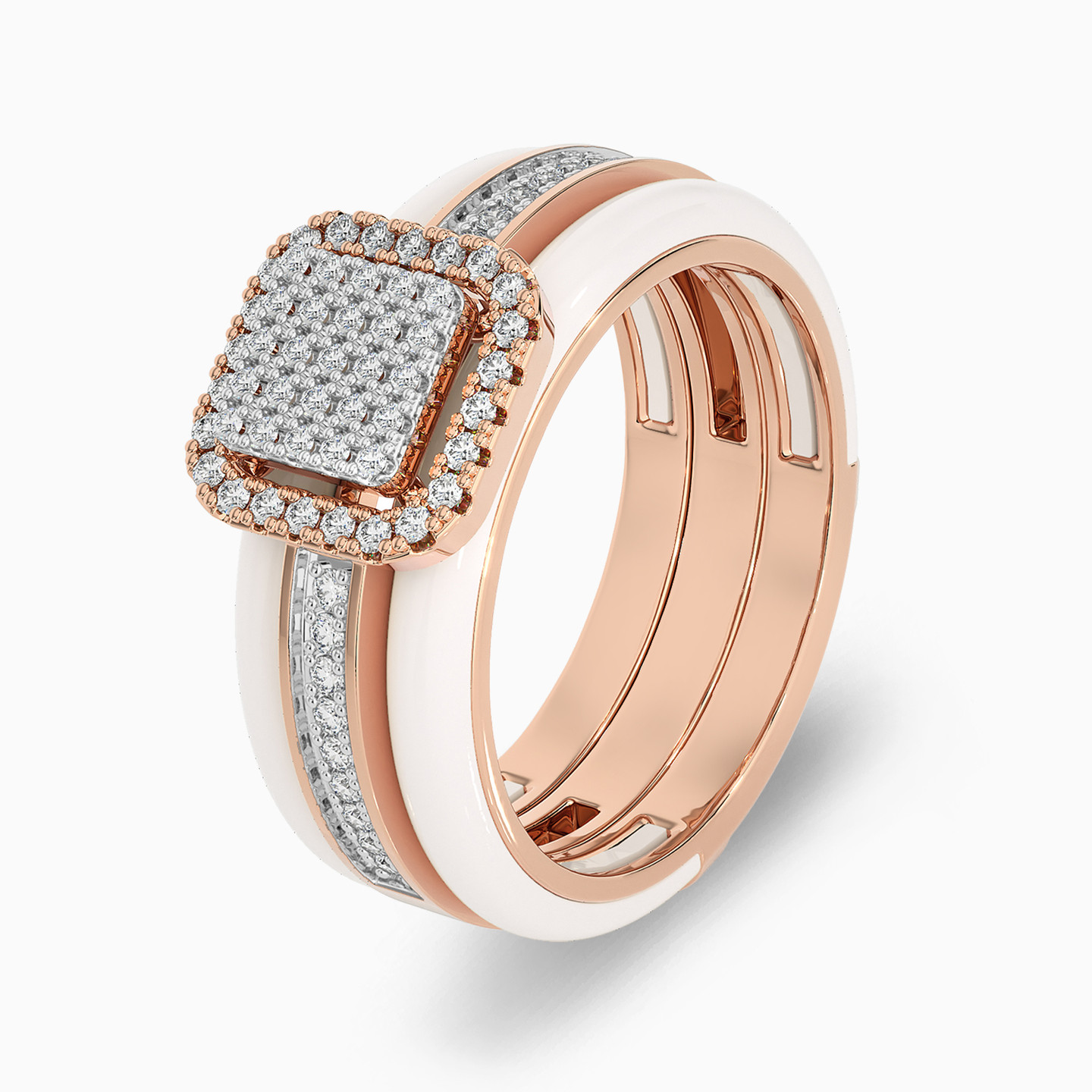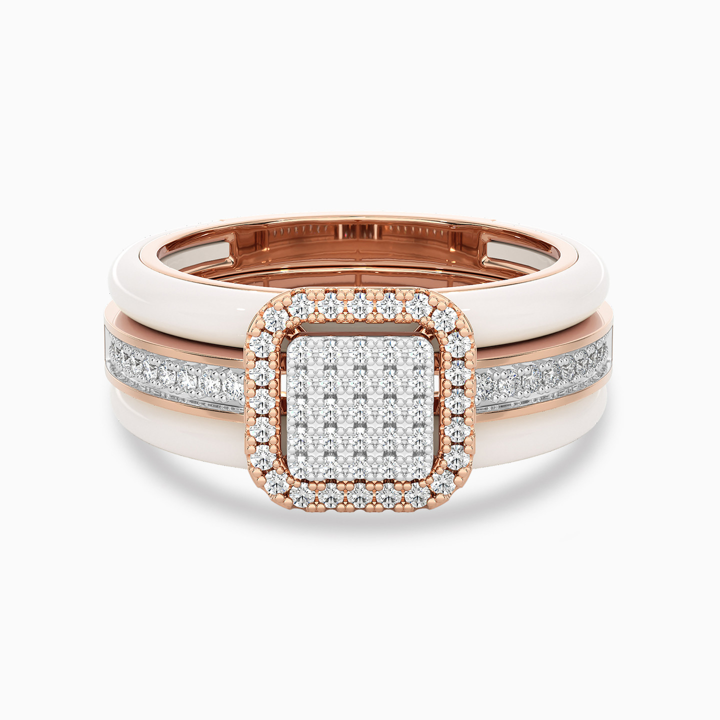 Express yourself with this mesmerizing twin ring set from L'azurde Diamonds. Fashioned in 18-karat rose gold, this stunning set includes a square diamond ring with shimmering halo, radiant with 0.25-carat brilliant cut diamonds that continue along the shank. The diamond beauty slips between a double band white enamel jacket ring for a look that turns heads. Whether worn together for maximum effect or worn individually, this ring set is a jewelry box essential.