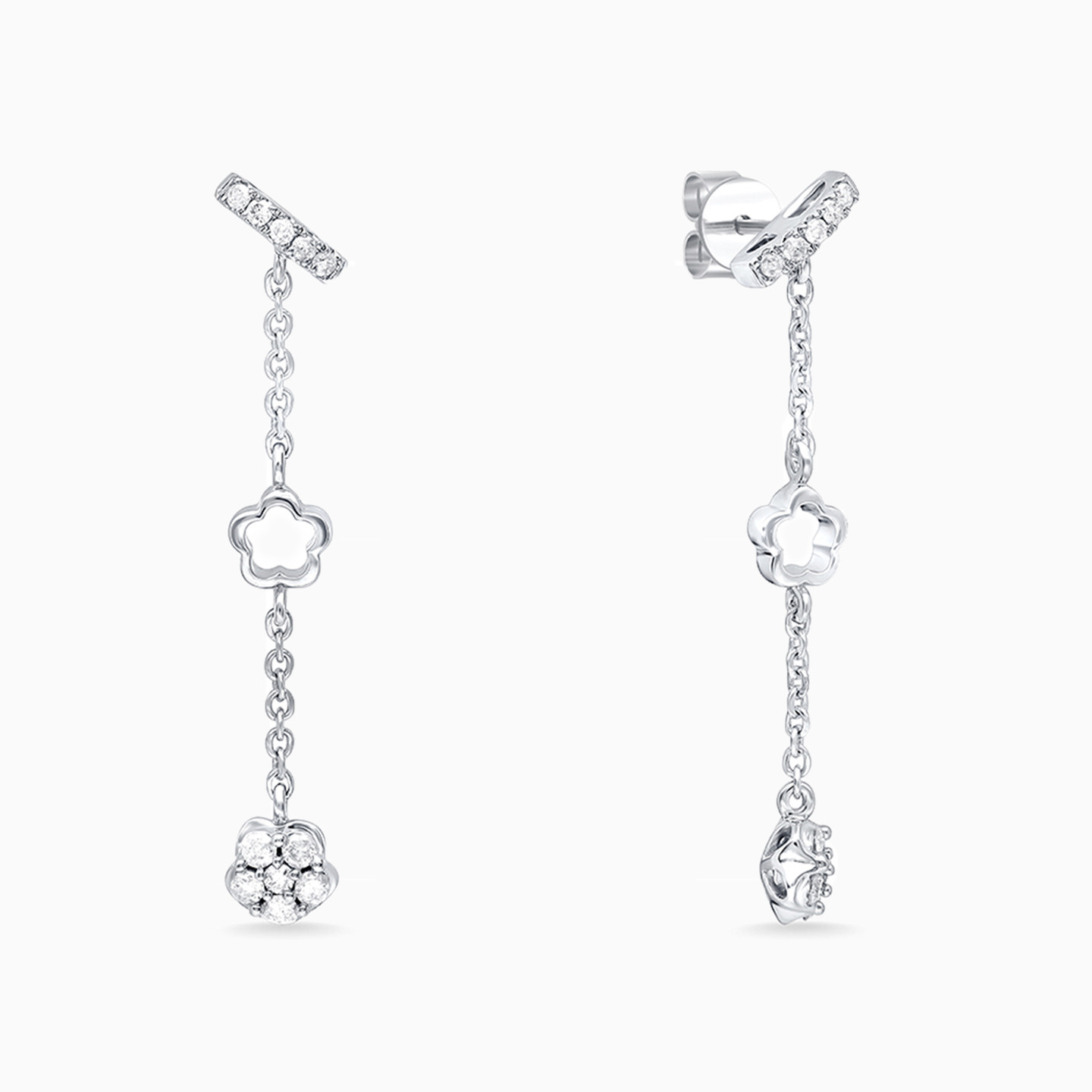 Light and flowy, these dangling earrings are sure to steal the show. Dropping into a brilliant-cut diamond encrusted flower from a push back post, these danglers are set in 18-karat white gold and feature 0.213-carats of diamonds. Night outs make the ideal setting for these stunning pieces, but don't let that stop you from styling them creatively.