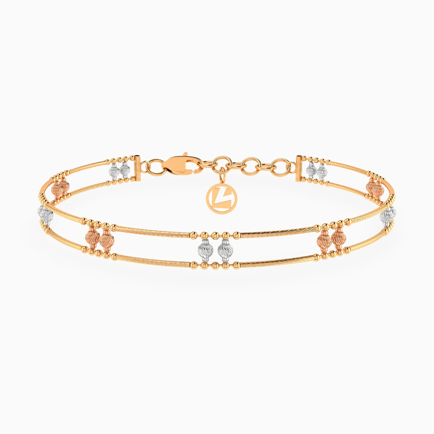 Invest in timeless elegance with this exquisite piece from Lazurde Gold! This gold bracelet celebrates artistry and modern charm with a unique double-row design, adorned by delicate duos of textured beads in enchanting shades of yellow, white, and rose gold. Perfect for adding a luminous touch of sophistication, this piece is crafted entirely in gold and radiates a graceful glow that beautifully complements any occasion. Let this bracelet be your statement of refined taste and everlasting beauty.