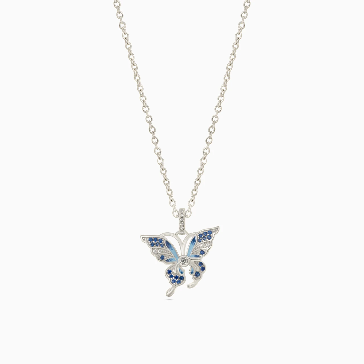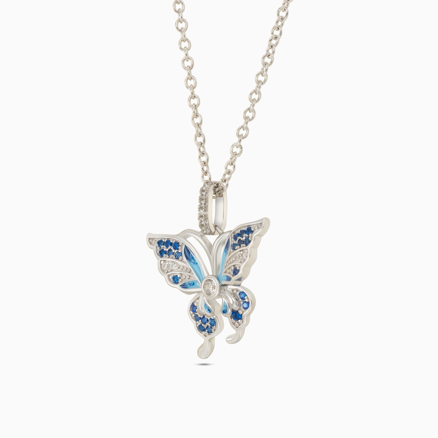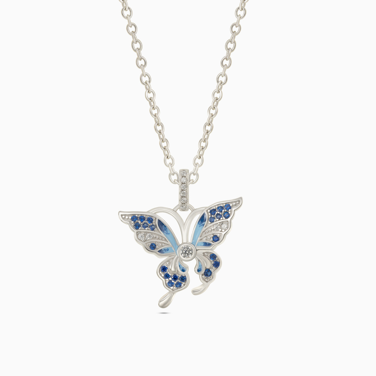 Add an enchanting touch to your wardrobe by wearing this graceful butterfly pendant with chain from L'azurde Waves. Whimsical and feminine, this enchanting sterling silver butterfly pendant shimmers with eye-catching colored stones and coated colored enamel details. We love the openwork design and how beautifully this piece enhances your office attire as well as evening wear and casual weekend looks.