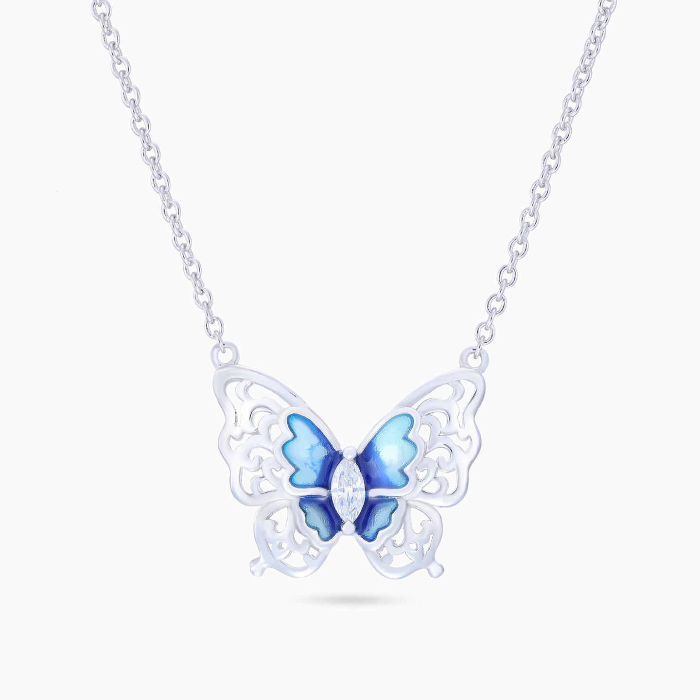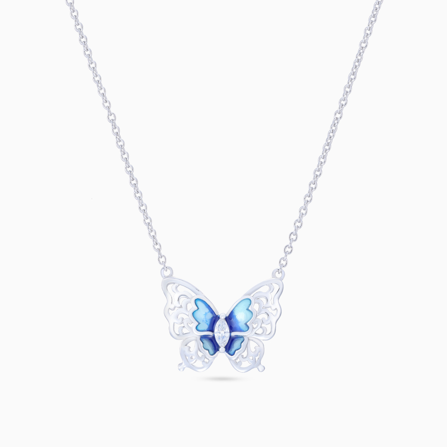 Discover affordable glamour and timeless style with this piece from Waves! This elegant sterling silver necklace features a beautifully detailed butterfly design, with a smaller blue enamel-coated butterfly delicately placed on top. At the center of the design, a marquise-shaped clear stone adds a touch of sparkle and sophistication. The combination of intricate design, vibrant color, and radiant stone creates a perfect balance of femininity and elegance, making this necklace a must-have addition to your jewelry collection.