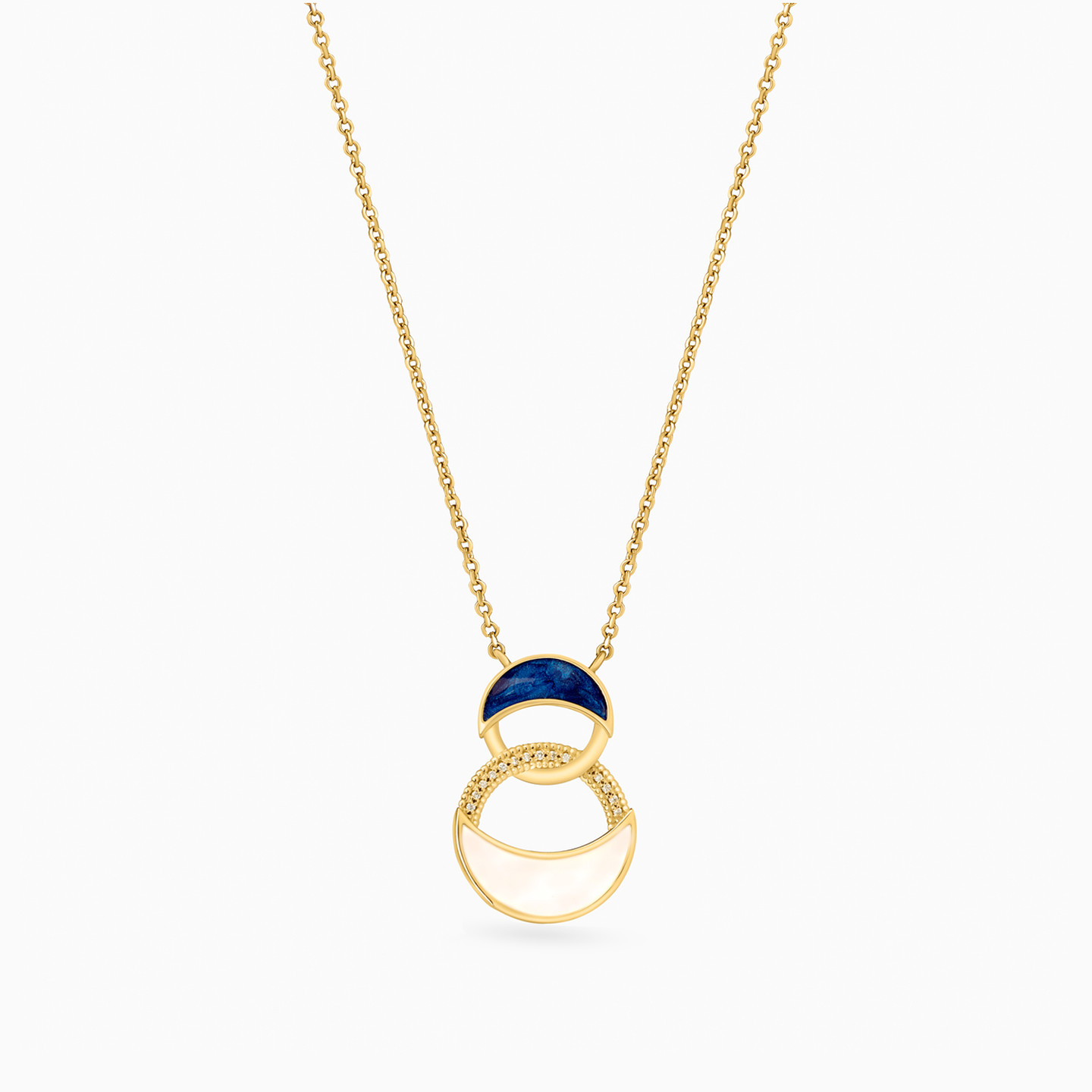 With an elegant pop of color and irresistible sparkle, this stunning pendant necklace from L'azurde Diamonds is sure to become your favorite go-to look. Beautifully crafted in 18-karat yellow gold, this chic necklace features two interlocking colored enamel circle motifs shimmering with brilliant cut diamond accents. We love this piece worn with the matching earrings and ring for a look that takes you from daytime to evening in style.