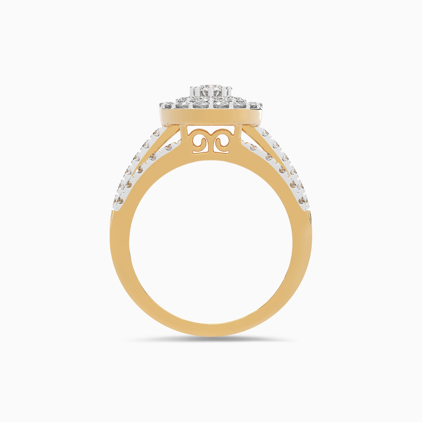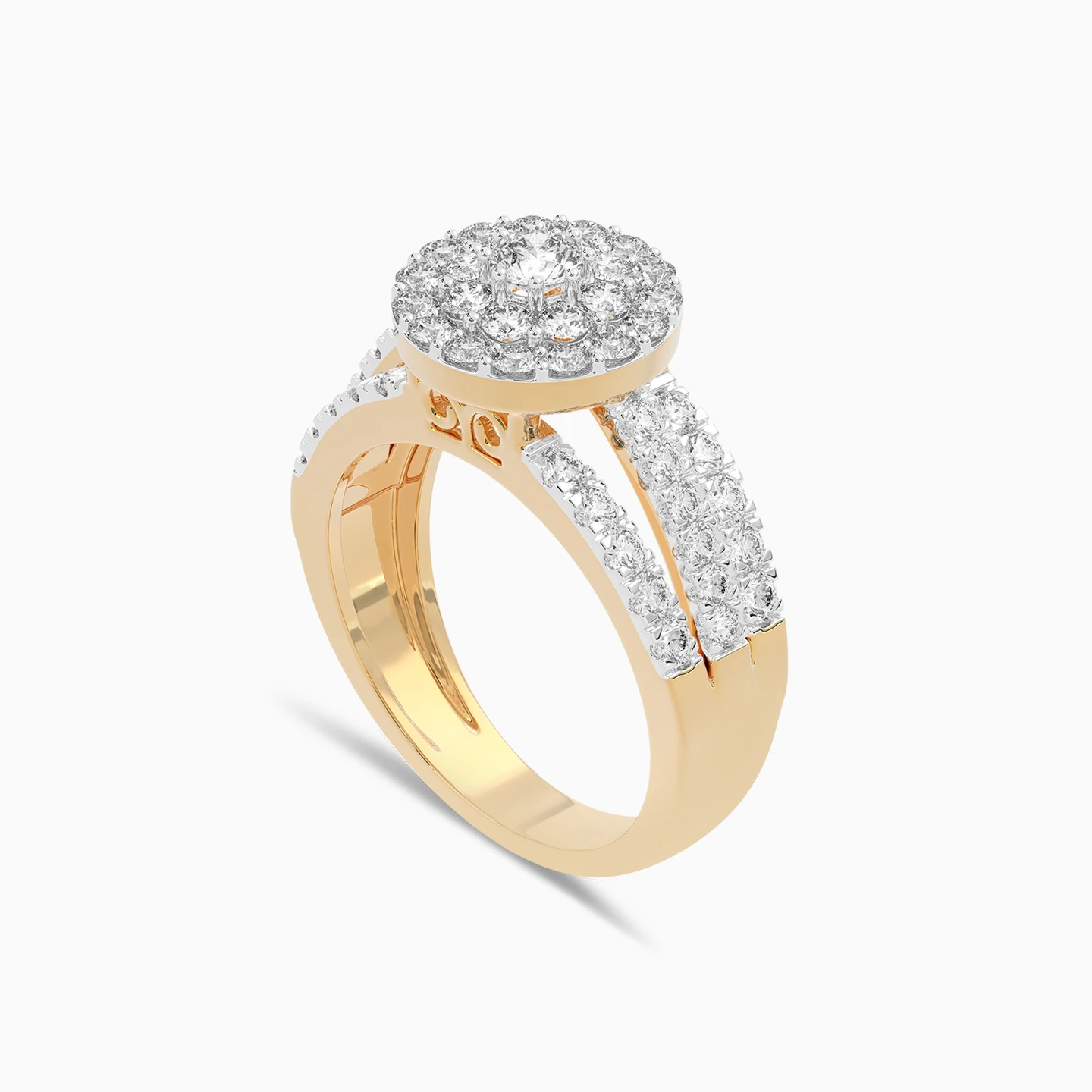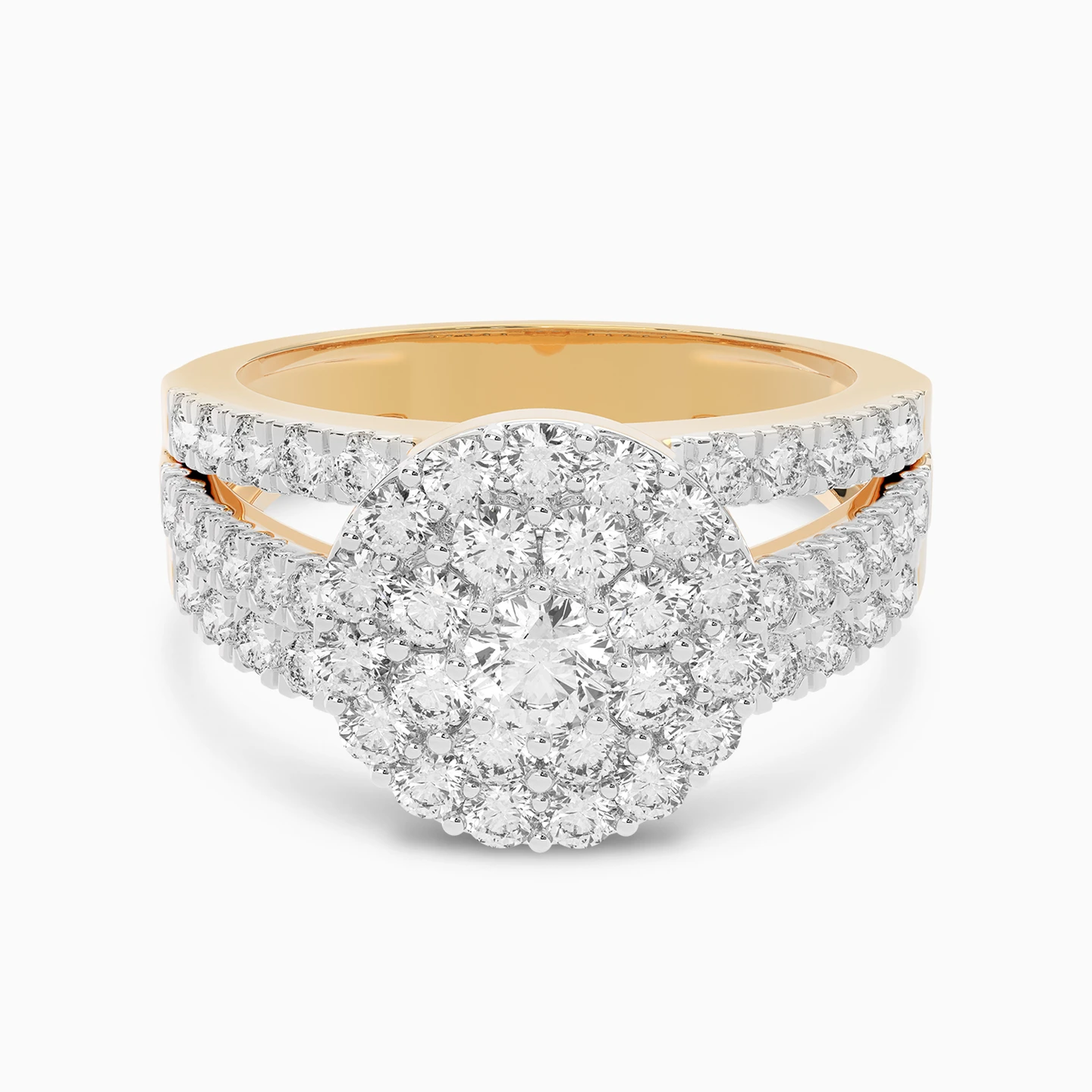 A radiant 18-karat yellow gold statement ring from L'azurde Daimonds that is a true embodiment of sophistication and grace. Three intertwining bands each adorned with brilliant cut diamonds, lead to a breathtaking centerpiece that captures the essence of nature's beauty. At its core sits a brilliant cut diamond, delicately set on prongs and embraced by a dual halo of prong-set diamonds, evoking the allure of a blooming flower in full bloom. This stunning ring can be your go-to for special occasions.