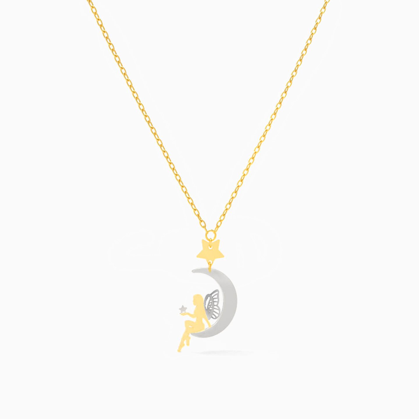 Seated atop a moon motif, the winged fairy in this pendant is filled with hope and joy. We love the two-tone construct and the petite chain that perfectly complements the delicate appeal of this piece. Wear it to your next girly night out or daytime soiree with a flowy outfit.