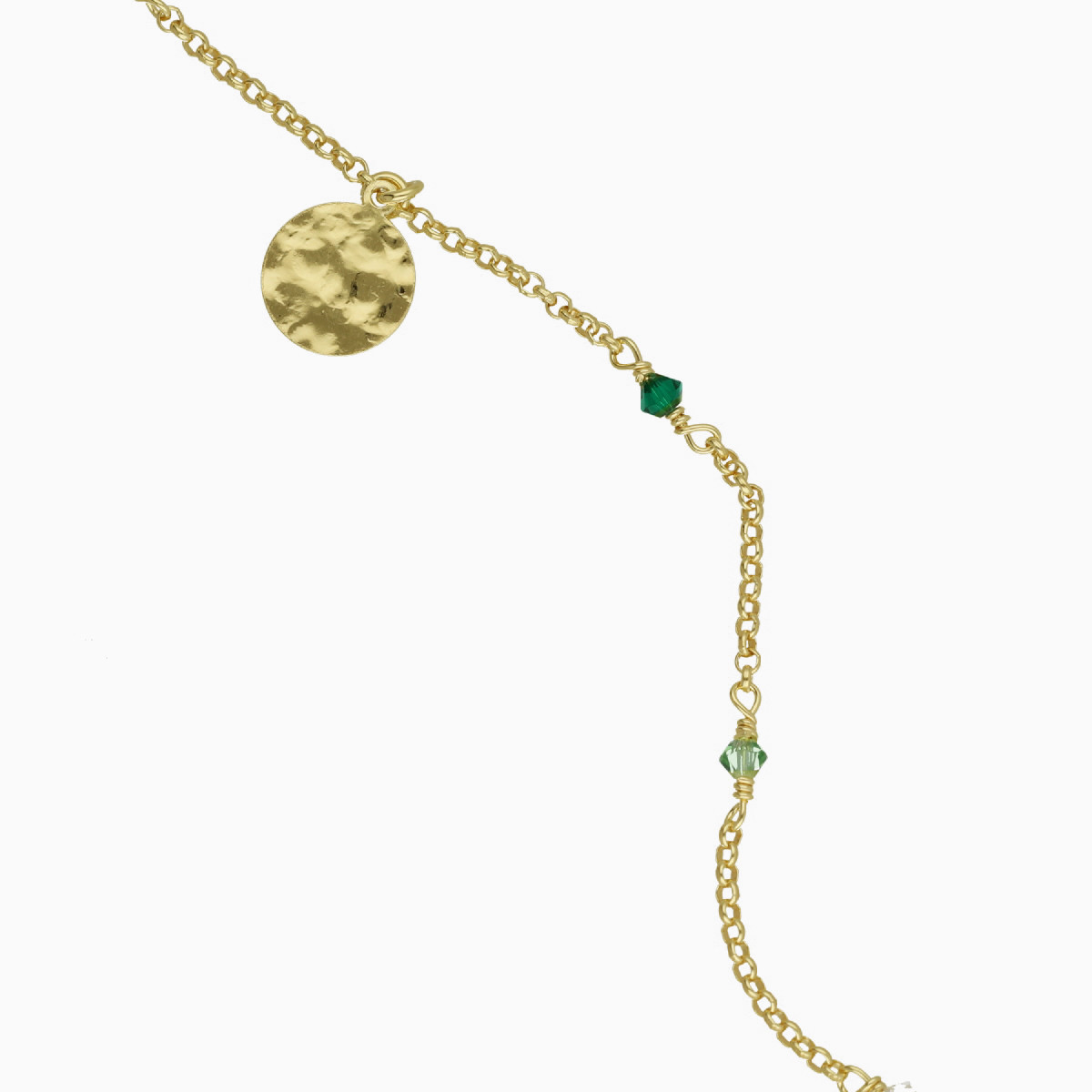 Unveil your ankle's true potential with this number from Waves. Dotted with green colored stones and a circle accent to the center, this yellow gold plated anklet transforms each step into a graceful dance of colors. Perfect for adding a touch of vibrancy to your summer outfits or infusing your everyday look with a hint of playfulness.