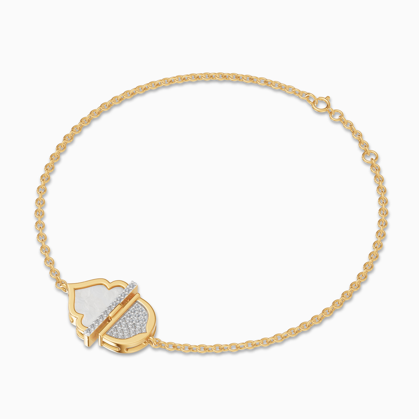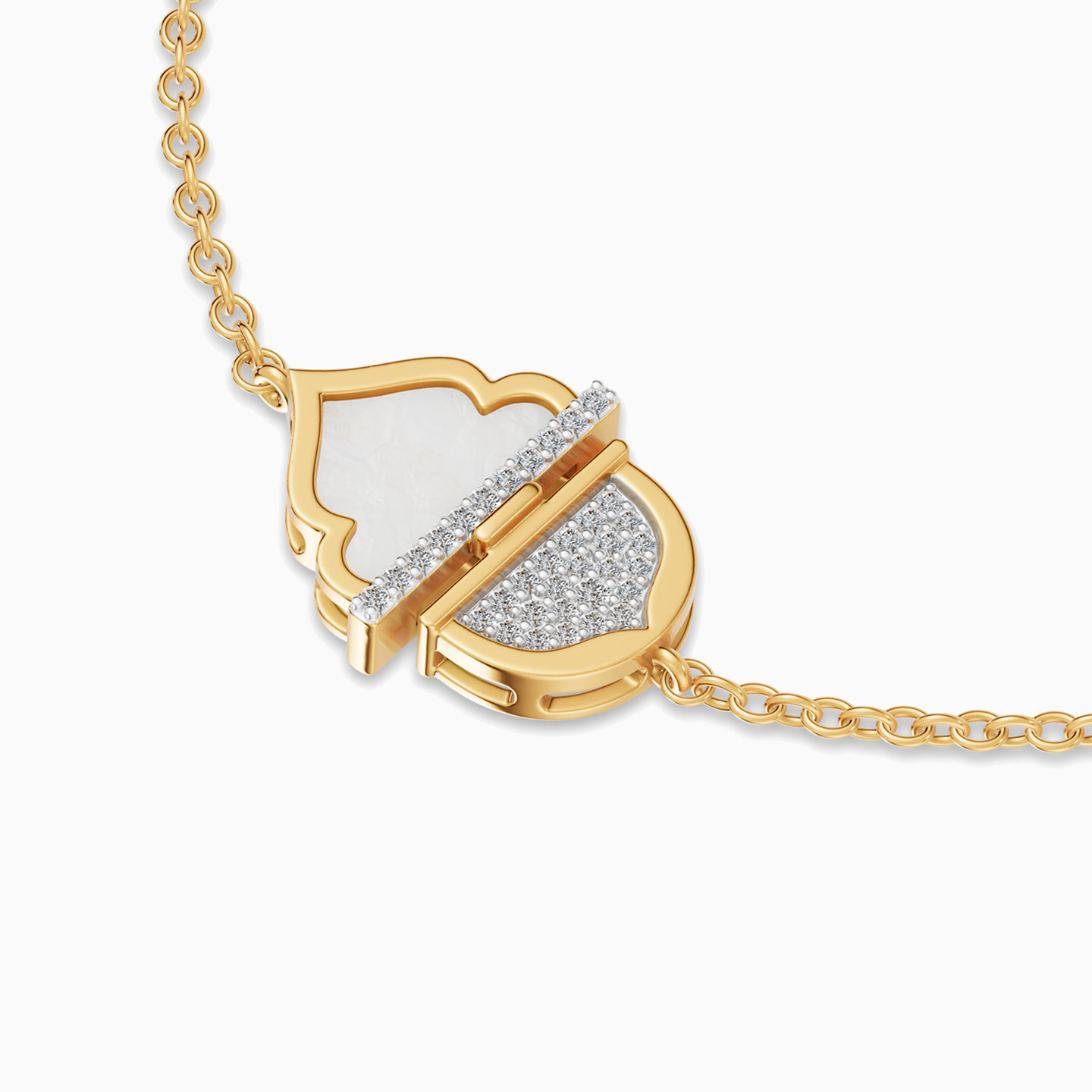 For the spirit of Ramadan, Geometry meets heritage in a composed expression of light. This Lazurde Diamonds chain bracelet is crafted in yellow gold, where an oriental arch frames a luminous mother of pearl stone, seamlessly connected to a diamond-studded half circle that adds a bold architectural edge. The contrast between softness and structure reflects confidence shaped by refined taste. A distinctive piece to gift with intention or to treasure as a timeless investment in elegant design.