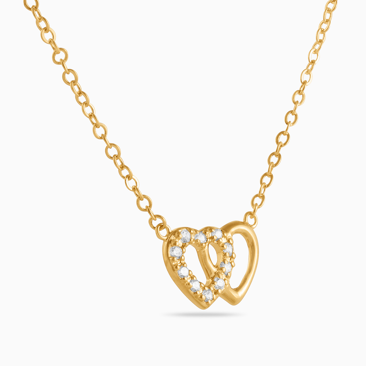 Let the world know that your significant other’s heart is taken with this romantic pendant necklace from the L'azurde Waves collection. Two interlocking hearts, one dotted with shimmering cubic zirconia stones, grace this stunning 18-karat yellow gold plated necklace. We recommend wearing this necklace with a V-neckline or a blouse to showcase the pendant on your neckline.