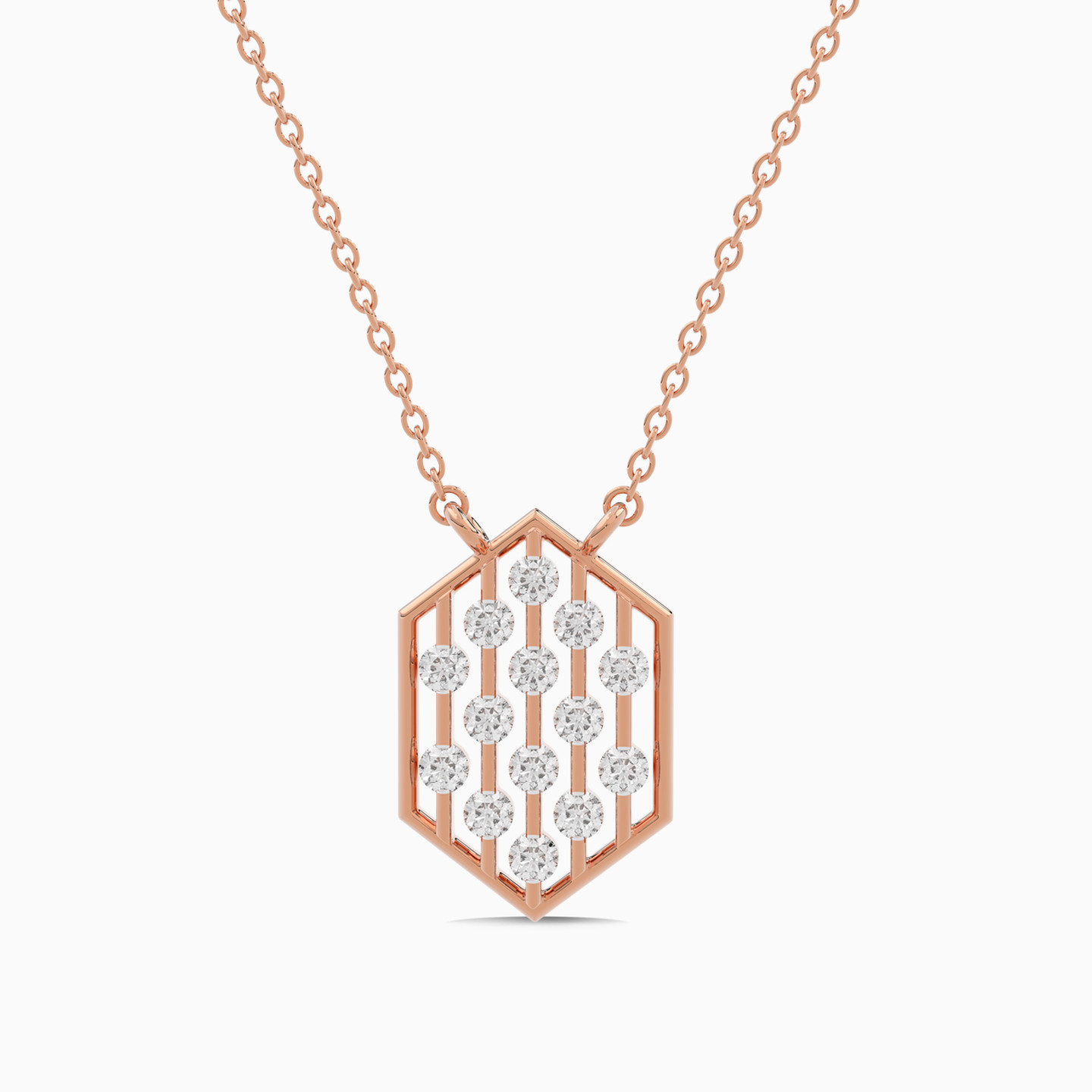Elevate your look to luxury with this shiny piece from Lazurde Diamonds! Crafted in 18K rose gold, this necklace features an hexagon-shaped pendant, meticulously filled with sparkling diamonds. The unique geometric design combines modern sophistication with classic elegance, while the radiant diamonds set in warm rose gold create a stunning contrast that captivates and enchants.