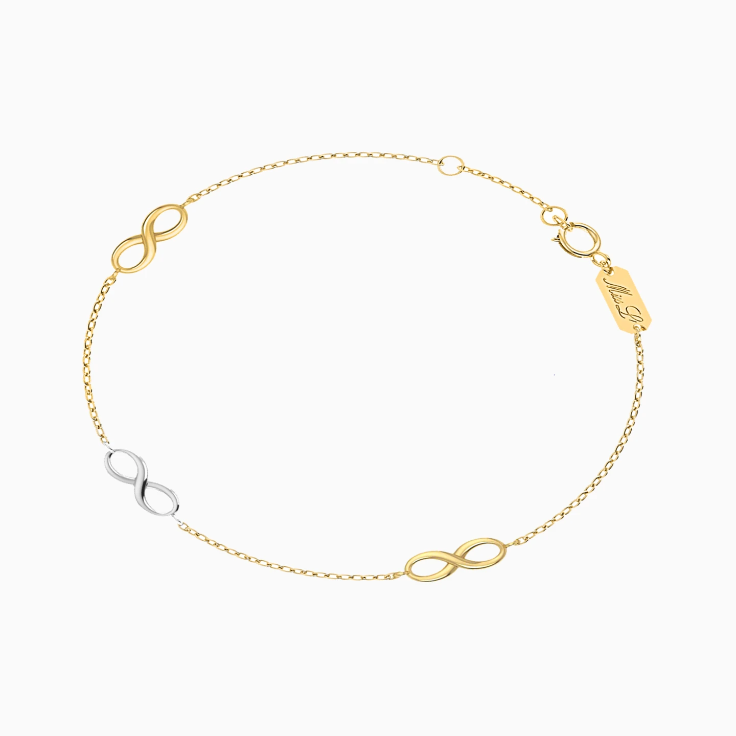 This two-tone infinity bracelet cast in 18-karat yellow and white gold makes a wonderful choice of wear over solid colors like white and black. You can wear it solo or stacked with similar pieces from our collection. This piece from Miss L’ makes a fitting choice for an AM to PM look.
