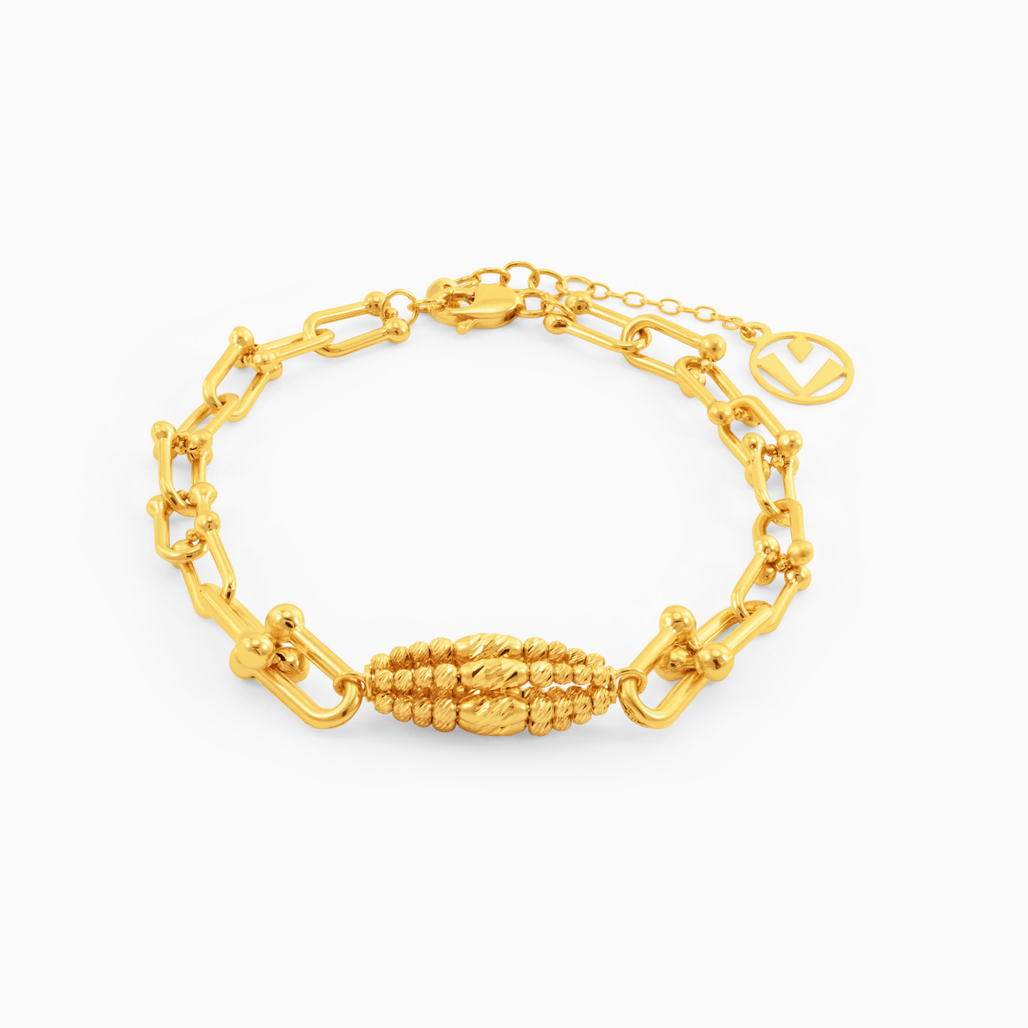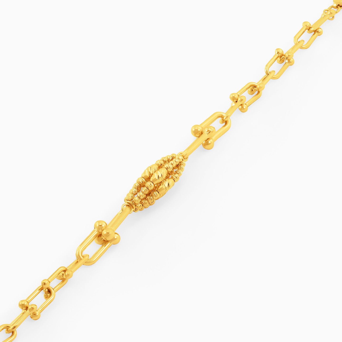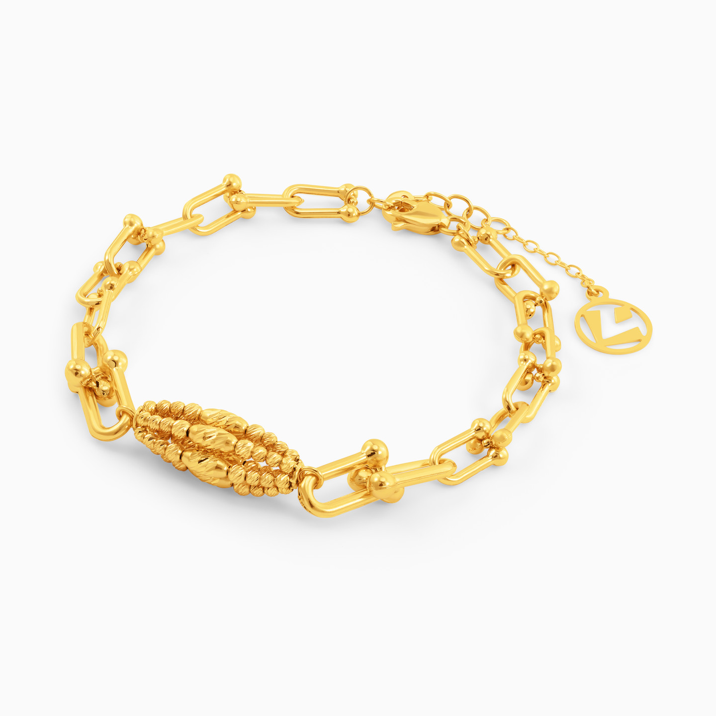 Every jewelry collection needs a stand-out piece that immediately captures attention and this stunning bracelet from L'azurde Gold is the one. Crafted in 18-karat yellow gold, this gorgeous bracelet features bold U-shaped links with multi-shaped beads at the center creating an oblong motif. We suggest making this bracelet the finishing touch to any look or the starting piece.